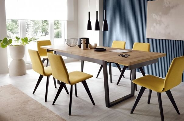 Podstawowym elementem wyposażenia salonu z jadalnią jest stół. W mniejszych wnętrzach świetnie sprawdzi się stół o okrągłym lub owalnym kształcie, który nie zdominuje przestrzeni. Większy metraż pozwala na umieszczenie dużego prostokątnego modelu, przy którym komfortowo zasiąść może większa liczba osób. Nowoczesny stół rozkładany idealnie spisze się w tego typu wnętrzach, a metalowe nogi dodadzą aranżacji charakteru i wyrazistości.