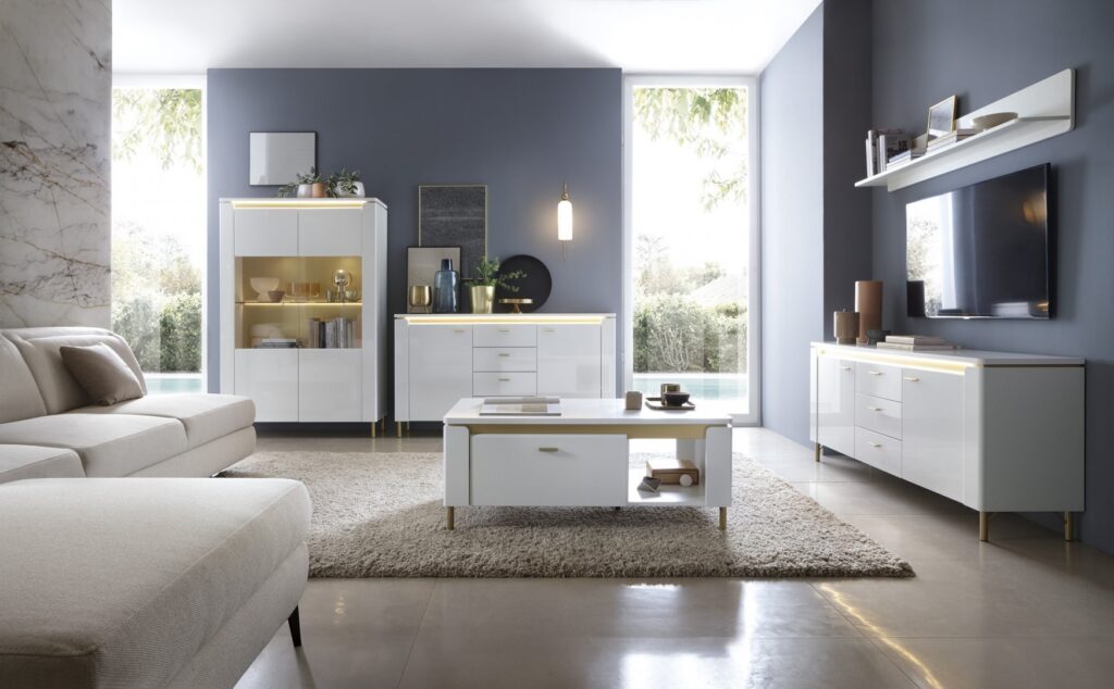 Drugim wyraźnym kierunkiem jest poszukiwanie indywidualnego wyrazu poprzez formę i detal. Tutaj na znaczeniu zyskują przeszklone witryny, pionowe ryflowania, asymetryczne podziały frontów czy subtelne kontrasty faktur. Takie elementy ożywiają przestrzeń i pozwalają jadalni wyróżnić się na tle reszty wnętrza. Jeśli zależy Ci na eleganckim, ale nowoczesnym wyrazie, warto zwrócić uwagę na kolekcję Lazio – białe fronty w połysku, złote uchwyty i wyważone proporcje tworzą spokojną, reprezentacyjną bazę, która nie wymaga dodatkowych ozdobników.