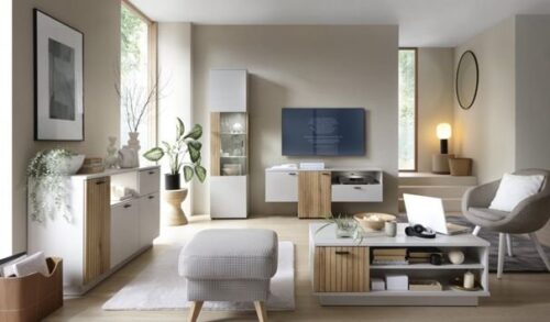 Jasne meble, takie jak białe czy kremowe, tworzą przyjemny kontrast i optycznie rozjaśniają przestrzeń. Kolekcja Toledo oferuje produkty w odcieniach – Biel Alpejska/Dąb Strirling – które idealnie uzupełnią brązową podłogę, wprowadzając świeżość oraz nowoczesny akcent. Warto również zwrócić uwagę na zastosowane w nich prowadnice i zawiasy z systemem cichego domykania, które zwiększają komfort użytkowania mebli do salonu z ciemną podłogą.
