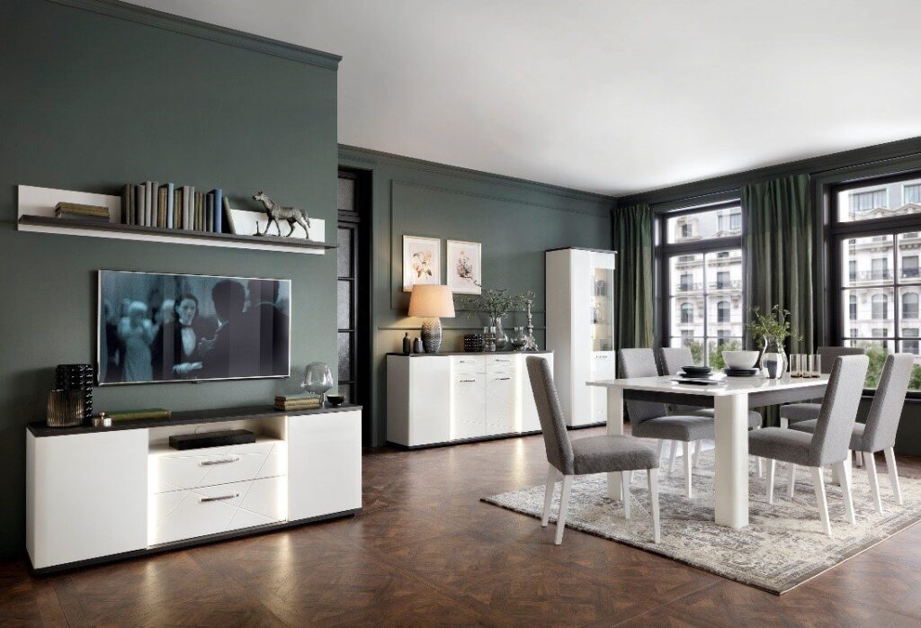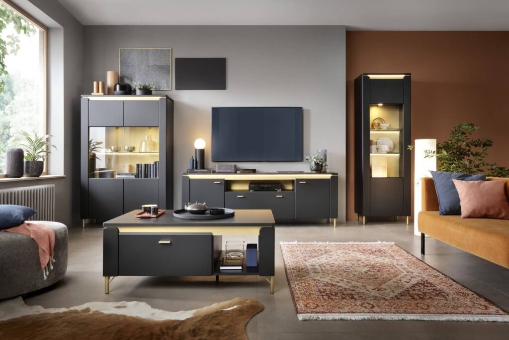 Przykładem mebli, które dobrze odnajdują się w tej estetyce, jest kolekcja Norica. Ciemne, matowe powierzchnie mebli tworzą piękne tło dla złotych uchwytów i nóżek, które dodają całości subtelnego blasku. Konstrukcyjne oświetlenie umieszczone w witrynach delikatnie podkreśla eksponowane przedmioty i wzmacnia efekt nowoczesnej elegancji.
