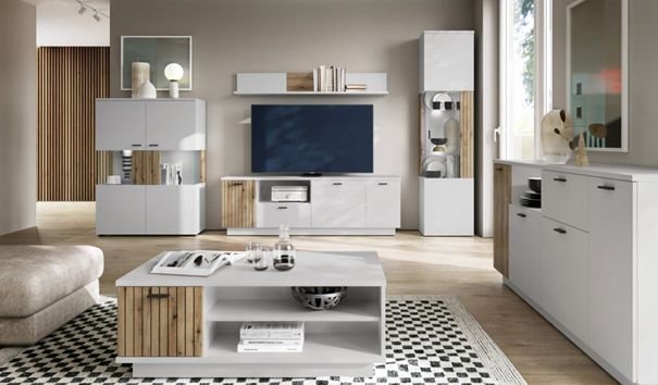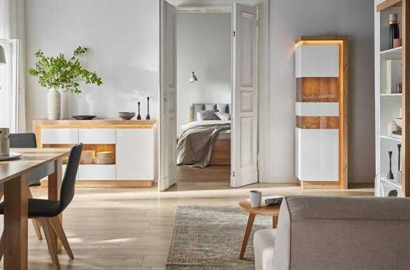 W nowoczesnym pokoju dziennym najlepiej sprawdzą się rozwiązania w jasnych barwach, a szczególnie białe odsłony mebli. Ich uniwersalny charakter, a przy tym łatwość w kompozycji z pozostałymi elementami wyposażenia, pozwala w prosty sposób zestawić je z dowolnymi dodatkami wystroju naszej nieruchomości. Nie można tutaj również zapomnieć o królującej w ostatnim czasie ofercie mebli szklanych. W połączeniu z opcjami frontów o połyskującym lakierze, które dodatkowo imitują naturalne surowce, będą dobrym wyborem, nadając salonowi charakteru, który idzie z duchem czasu.