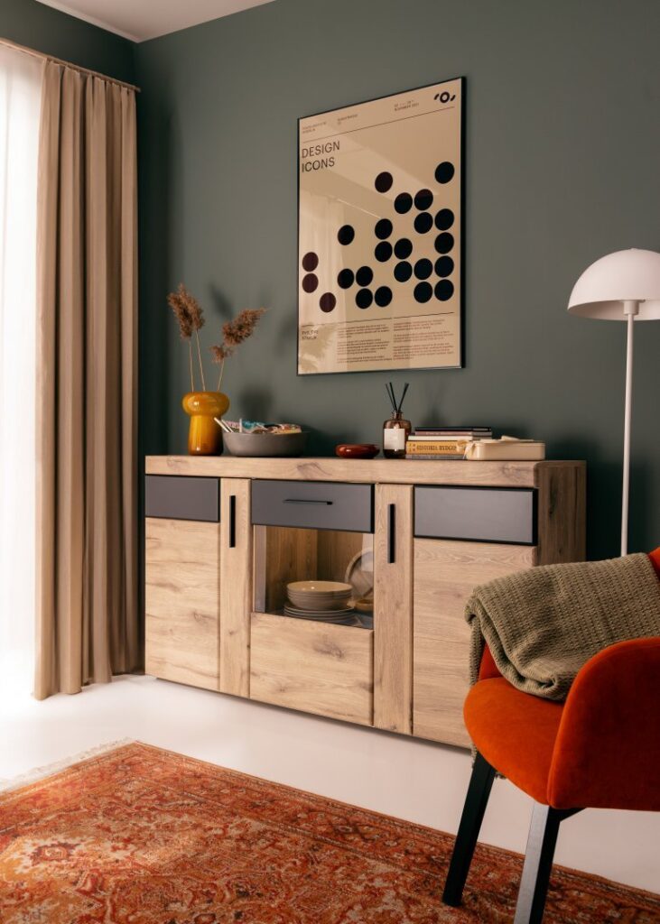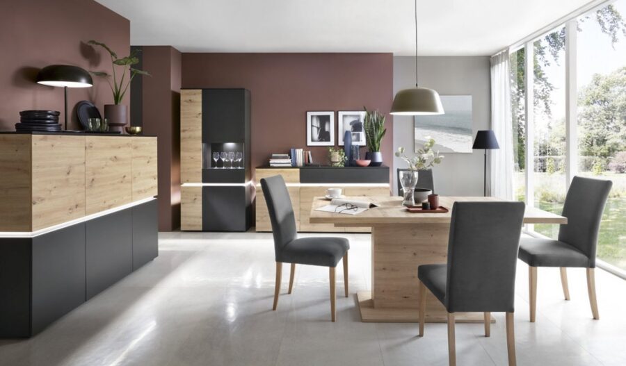 Nowoczesna kolekcja mebli Grano została stworzona z myślą o różnych pomieszczeniach. Począwszy od salonu, jadalni, a kończąc na przedpokoju. Nie dość, że charakteryzuje się prostą, stylistyką, to dodatkowo odznacza się kolorem naturalnego surowca w odcieniu Dąb Viking. Posiada więc meble o ponadczasowym wyglądzie, które doskonale współgrają z ciemnymi odcieniami szarości.