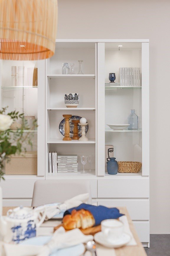 Po siódme – delikatnie podświetlane witryny i wnętrze komody nadają wnętrzu ciepłego klimatu i pięknie eksponują dekoracje, książki, albumy czy inne dodatki.