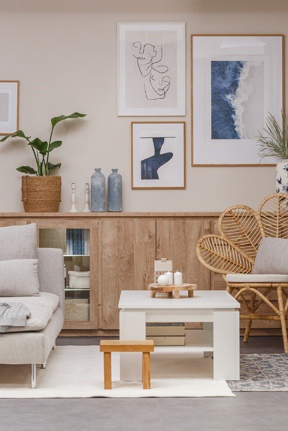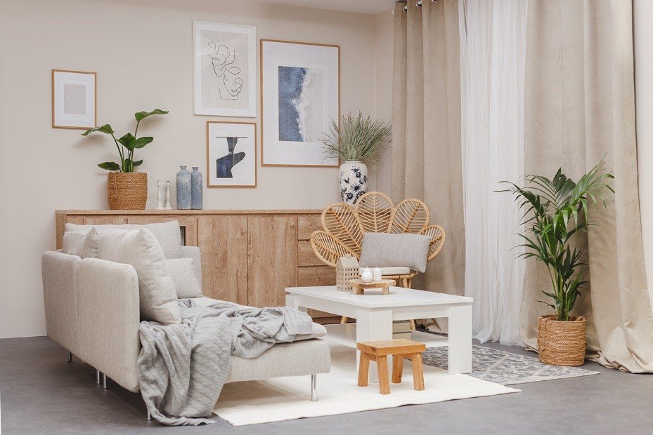 Aby ożywić wnętrze, a jednocześnie utrzymać w nim przytulną atmosferę, Karolina zagrała naturalnymi dodatkami. Mamy tu elementy skandynawskie, soft boho i hampton. Duży, zawieszony nad stołem bambusowy żyrandol, doskonale uzupełnia część jadalnianą. Wiklinowy, oryginalny fotel nadaje strefie relaksu charakteru, jednocześnie wyraźnie ją wyznaczając. Szara sofa, miękki jasny dywan czy beżowe zasłony, sprawiają, że przestrzeń stała się ciepła i zaprasza do spędzania w niej każdej wolnej chwili. Nie zabrakło też wyraźnych granatowych akcentów oraz zielonych roślin, które kontrastują z jasnymi, pastelowymi kolorami.