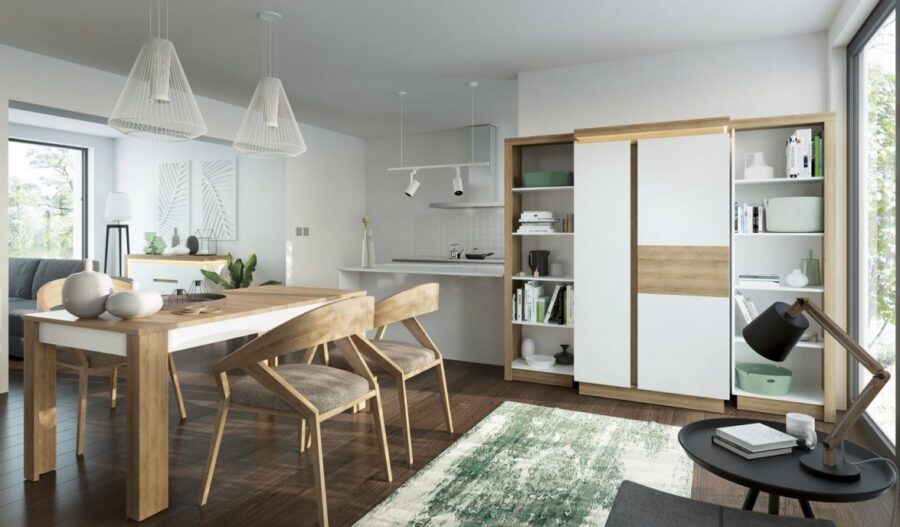 Nasz wirtualny showroom Meble Wójcik wyróżnia się na tle konkurencyjnych rozwiązań unikalnymi znacznikami produktów. Dzięki nim, podczas Twojego wirtualnego spaceru po naszym salonie meblowym, masz możliwość zapoznania się z interesującym Cię produktem, aby natychmiast otrzymać o nim szczegółowe informacje – takie jak zdjęcie aranżacyjne, nazwę czy typ mebla. Ale to nie wszystko! Przy każdym z produktów umieściliśmy odnośniki bezpośrednio do naszego sklepu internetowego. Dzięki temu, jednym kliknięciem możesz przenieść się na stronę produktu, zapoznać się z dodatkowymi informacjami i, jeśli zechcesz, dokonać zakupu – wszystko to bez wychodzenia z domu i bez konieczności przeszukiwania wielu stron.