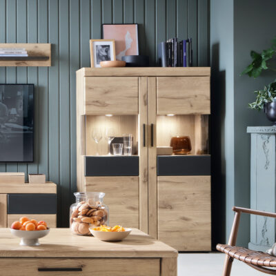 Witryna 1-drzwiowa, lewostronna, przeszklone boki, dekor naturalne drewno