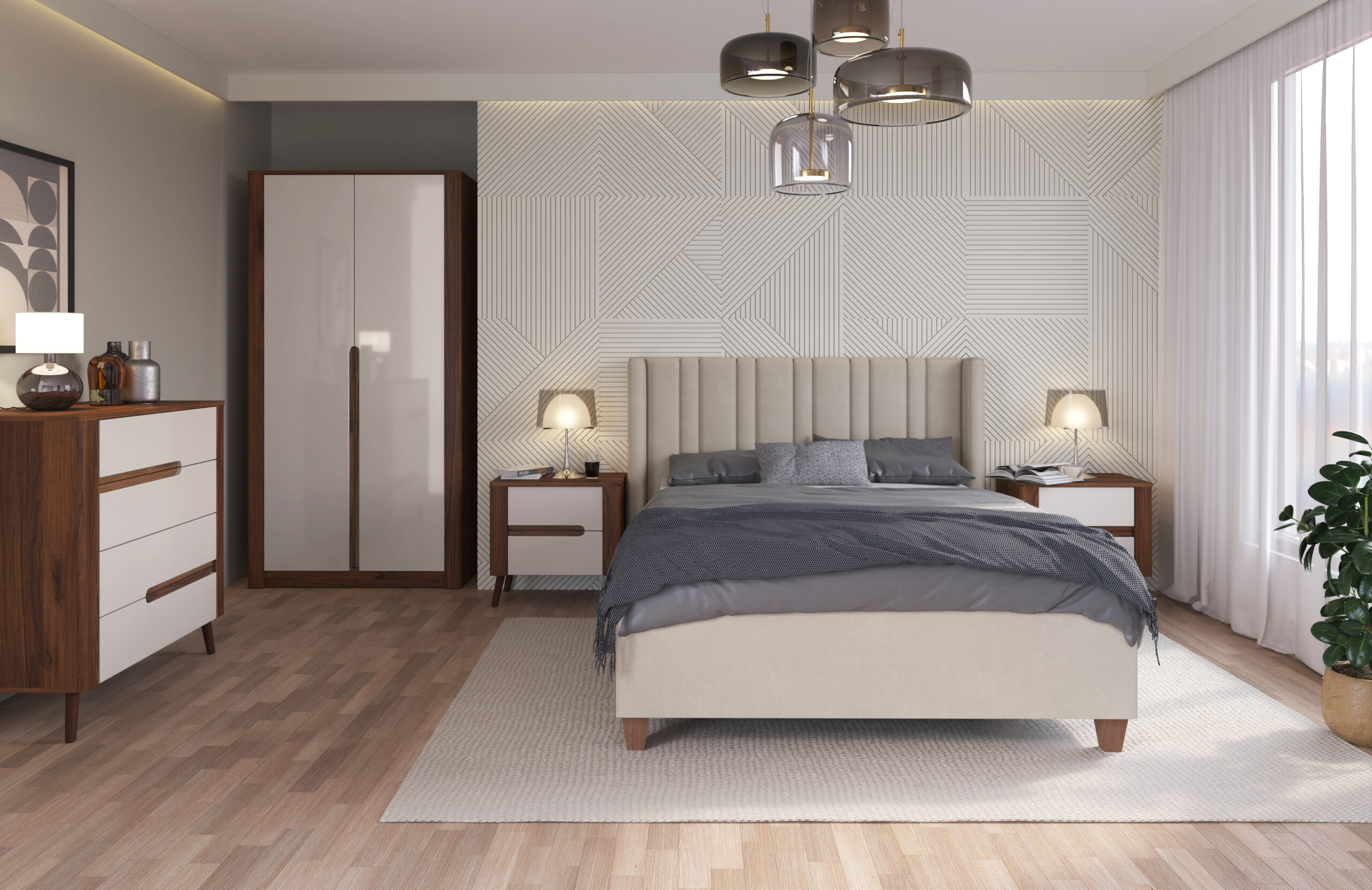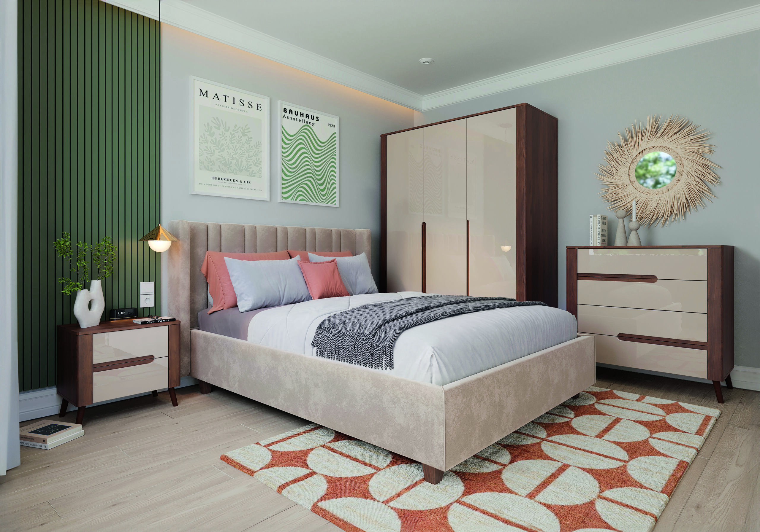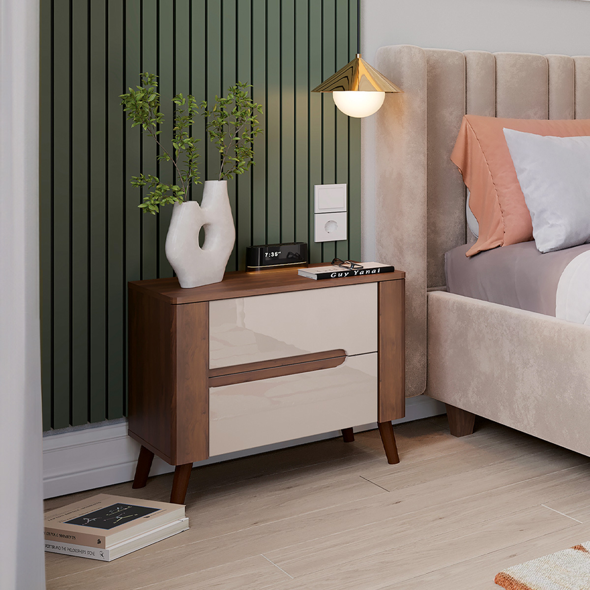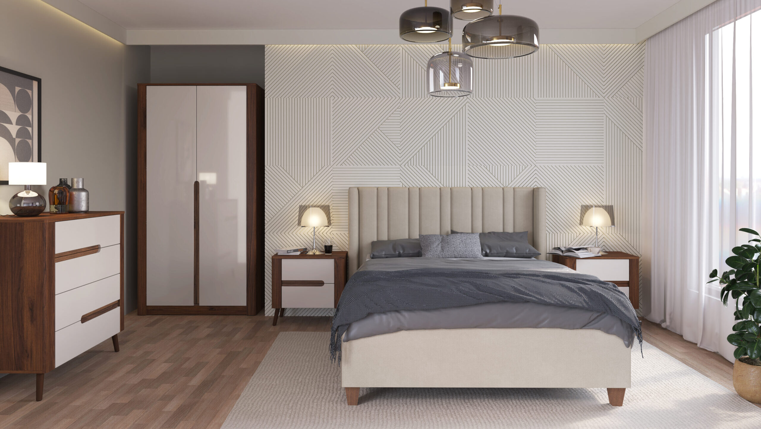 Klasyczna, elegancka sypialnia- tak można opisać tę kolekcję. Piękny orzechowy dekor, będący kwintesencją stylu, doskonale współgra z neutralnymi, piaskowymi frontami w połysku, tworząc wiciszające i uspokajające wnętrze. Kluczowym elementem są tapicerowane łóżka, obite tkaniną dopasowaną do frontów. Każdy detal jest starannie dopracowany, co sprawia , że meble wyglądają jak "milion dolarów", a kosztują dużo mniej.
