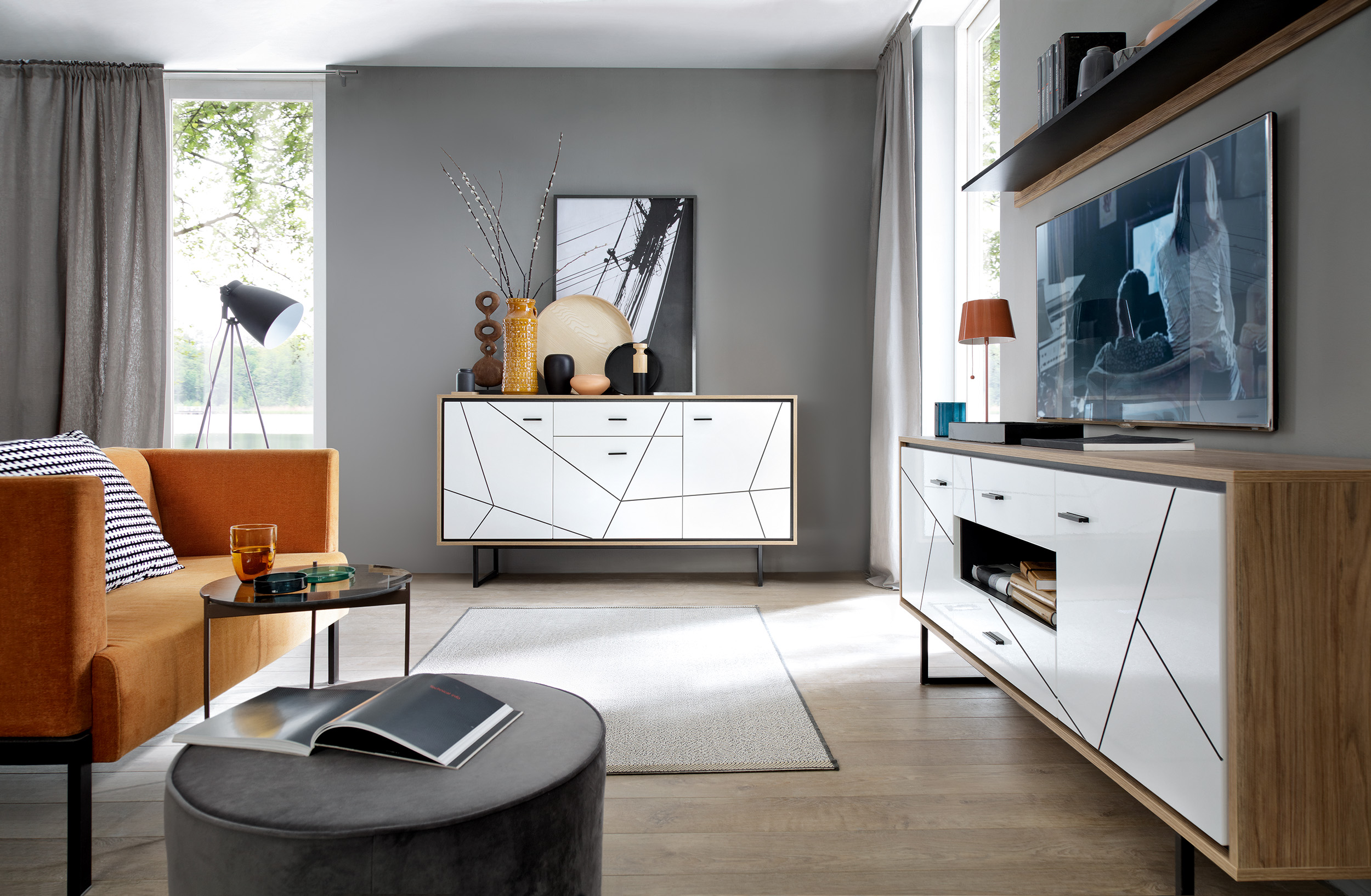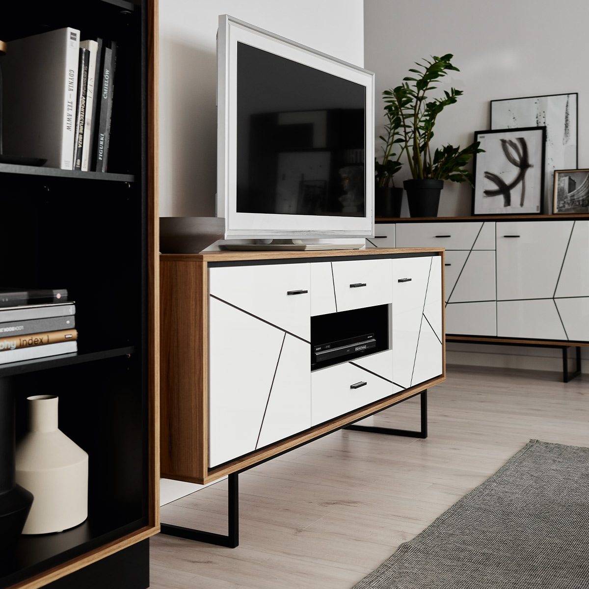 Witryna szeroka do salonu, biały połysk