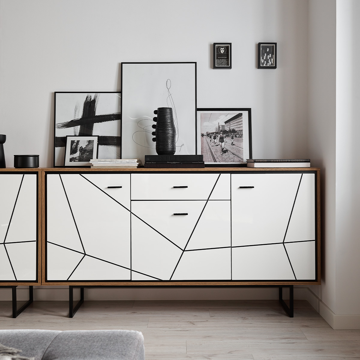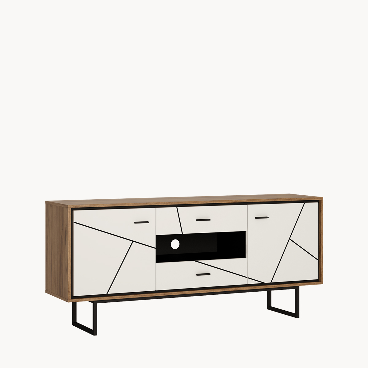 Komoda 3-drzwiowa z szufladą, biały połysk, metalowy stelaż