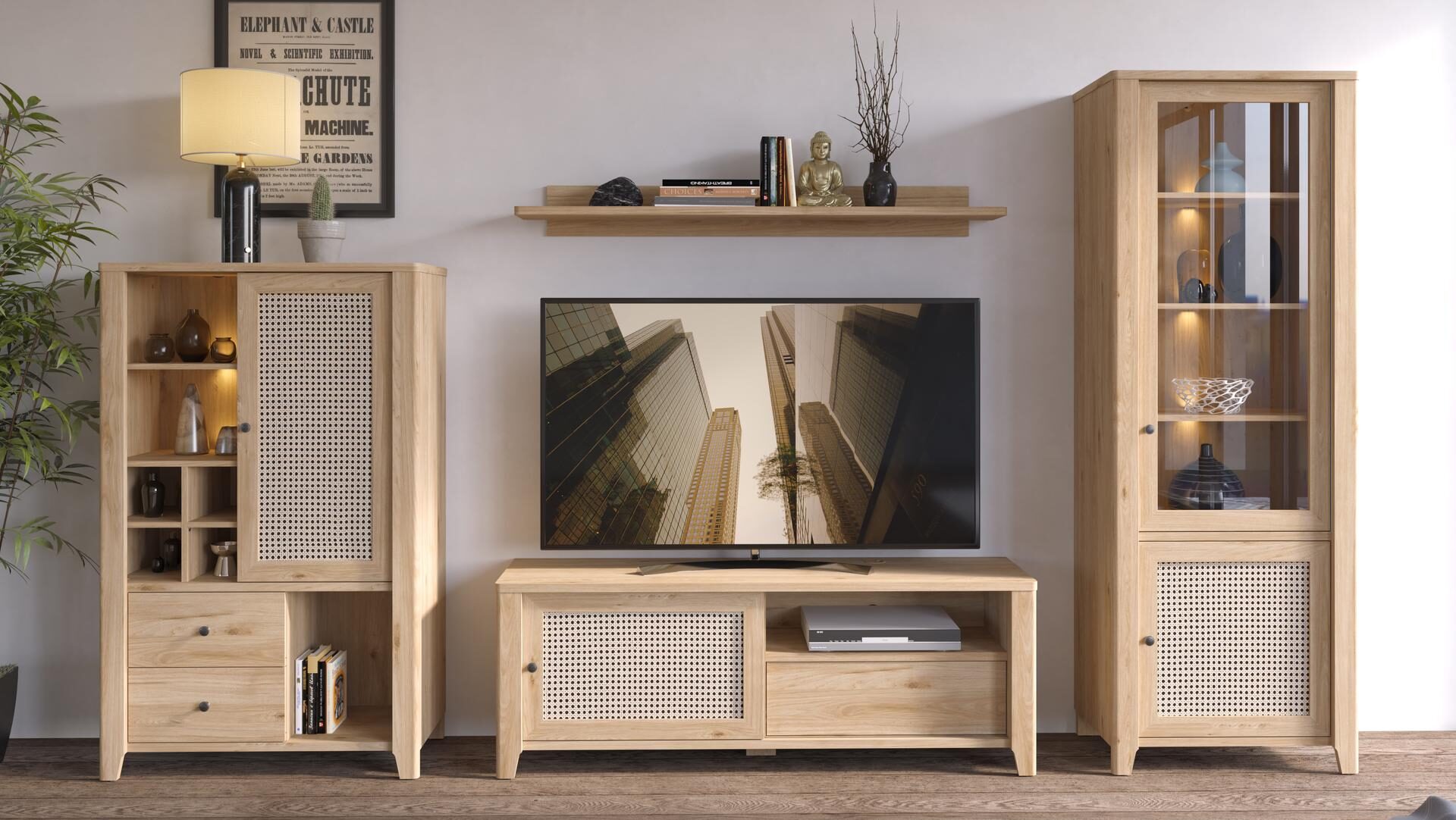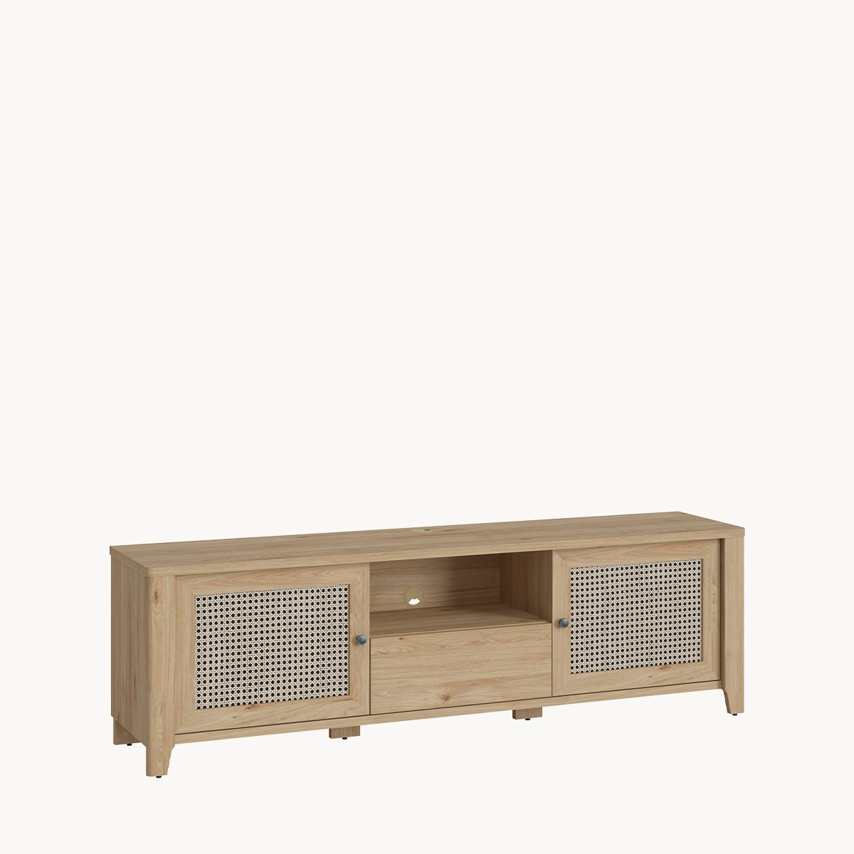 Komoda pod TV z szufladą, imitacja ratanu, dekor naturalne drewno