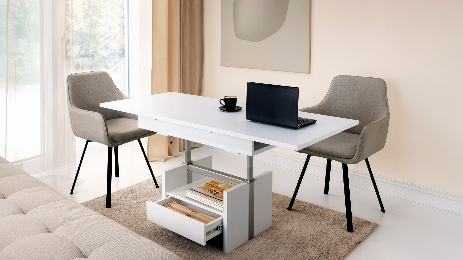 Ławostół z szufladą i półką, rozsuwany i podnoszony blat, biały
