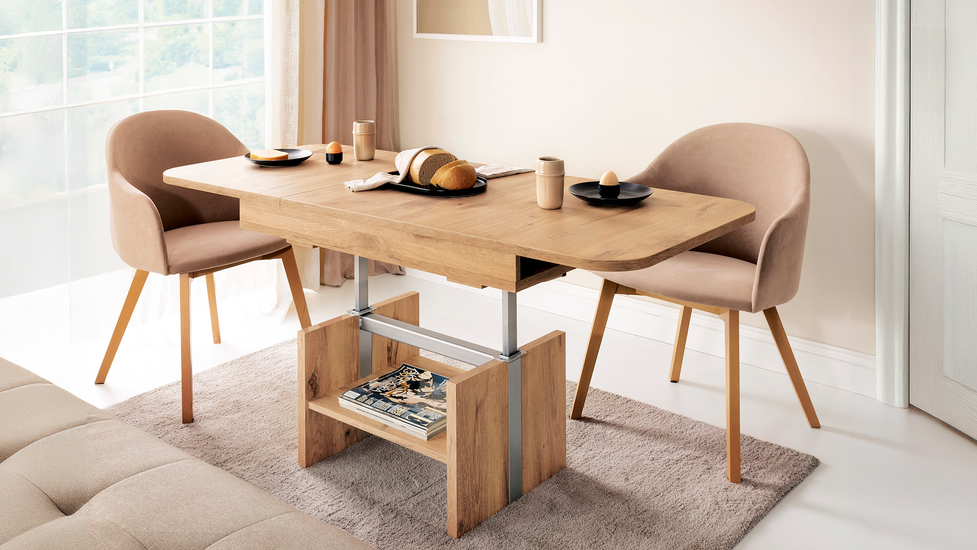 Ławostół z półką i zaoblonymi krawędziami, rozsuwany i podnoszony blat, kolor drewno