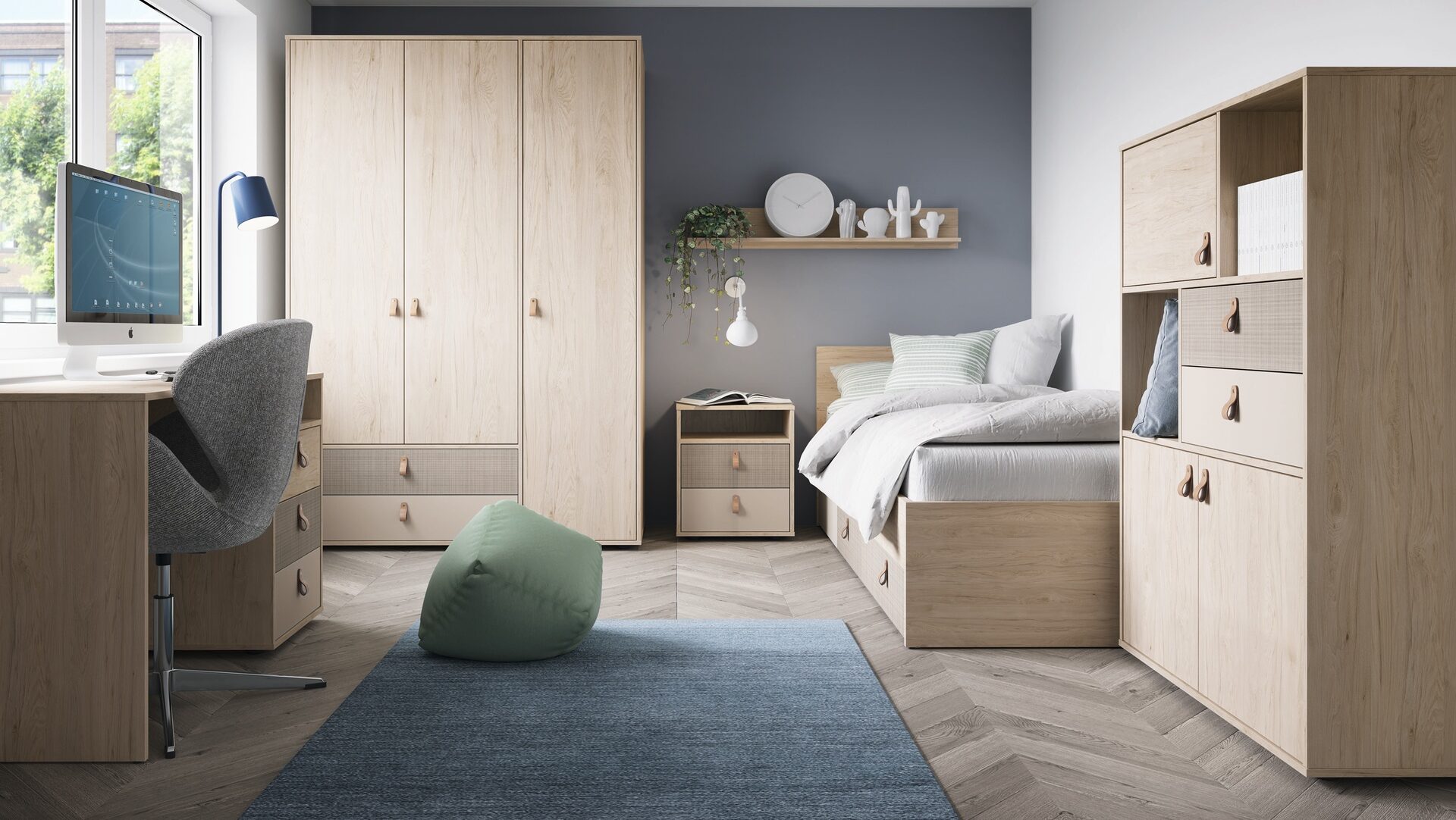 Kolekcja Denim to proste kształty utrzymane w tonacji jasnego drewna w zimnym odcieniu, w połączeniu z subtelną szarością. Skórzane uchwyty to stylowy dodatek podkreślający wyjątkowość kolekcji, przeznaczonej do użytku przez osoby, poszukujące prostoty i funkcjonalności w nowoczesnym wydaniu. Kolekcja oprócz niezawodnych mechanizmów posiada ciekawe dodatki w postaci praktycznych dostawek do łózek, wezgłowia tekstylnego oraz oświetlenia.