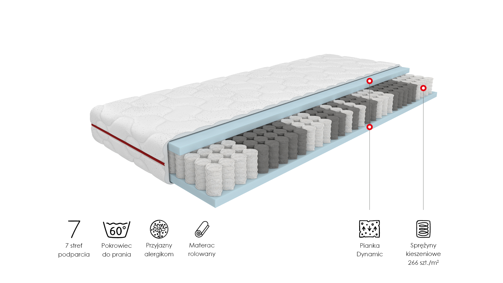 Zapraszamy do odkrycia nowego wymiaru snu z najnowszymi modelami materacy, stworzonymi z myślą o doskonałym wsparciu dla Twojego zdrowego i regenerującego wypoczynku. Nasza kolekcja materacy łączy w sobie najnowsze technologie z wysokiej jakości materiałami, każdy materac z naszej oferty został starannie zaprojektowany, z uwzględnieniem różnorodnych potrzeb i preferencji naszych klientów. Znajdź idealnego towarzysza dla Twojego snu.
