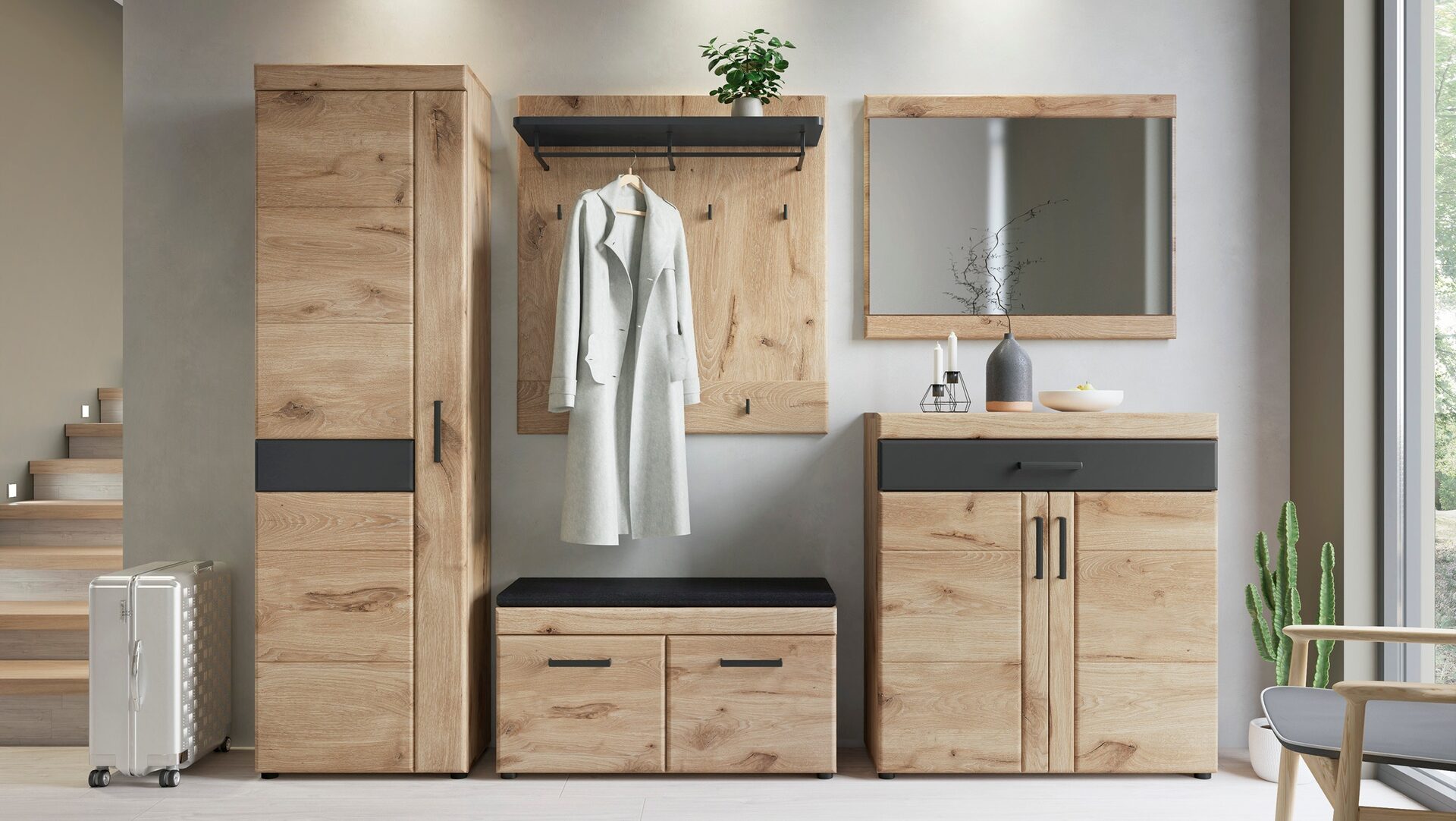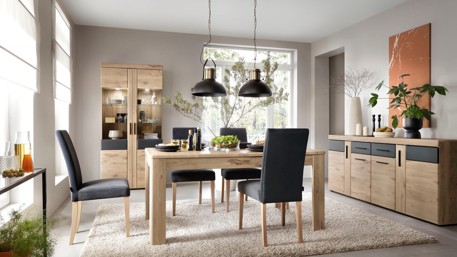 Kolekcja mebli GRANO dedykowana jest do zastosowania w salonie, jadalni i przedpokoju. Bryły utrzymane zostały w prostej, nowoczesnej stylistyce. Kolorystyka naturalnego dębu (odcień Dąb Viking) nadaje meblom ponadczasowego charakteru oraz efektownie komponuje się z elementami w ciemnym odcieniu szarości. Minimalistyczne uchwyty podkreślają nowoczesny charakter mebli.