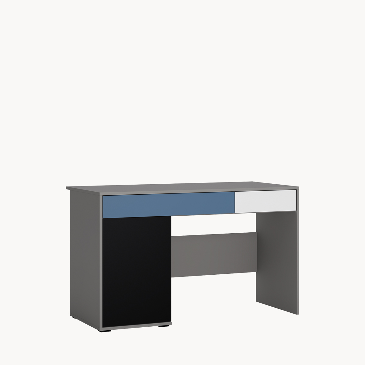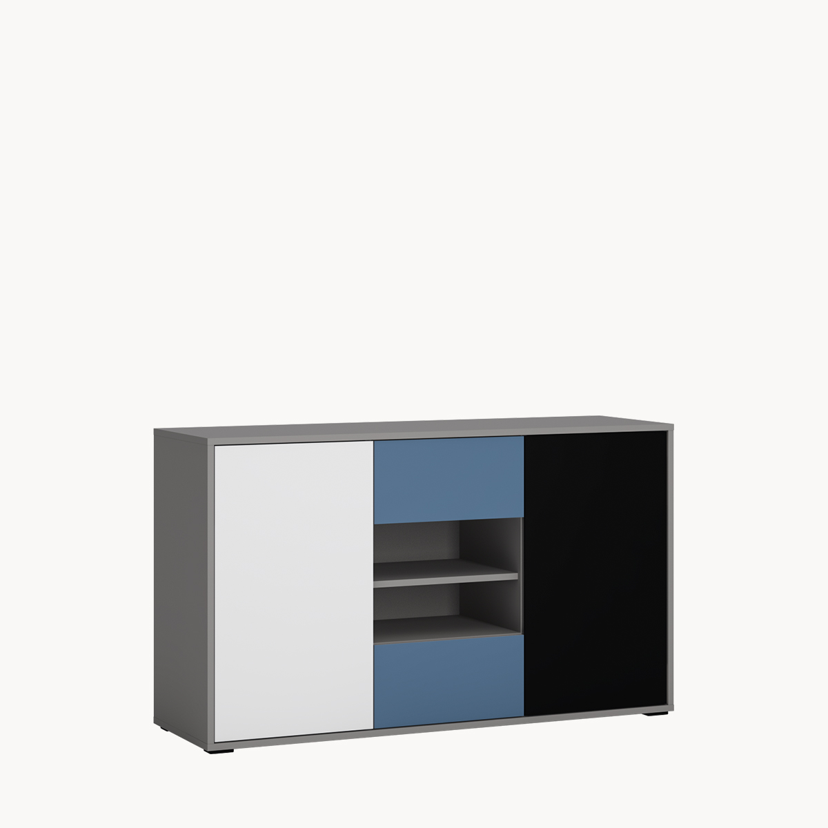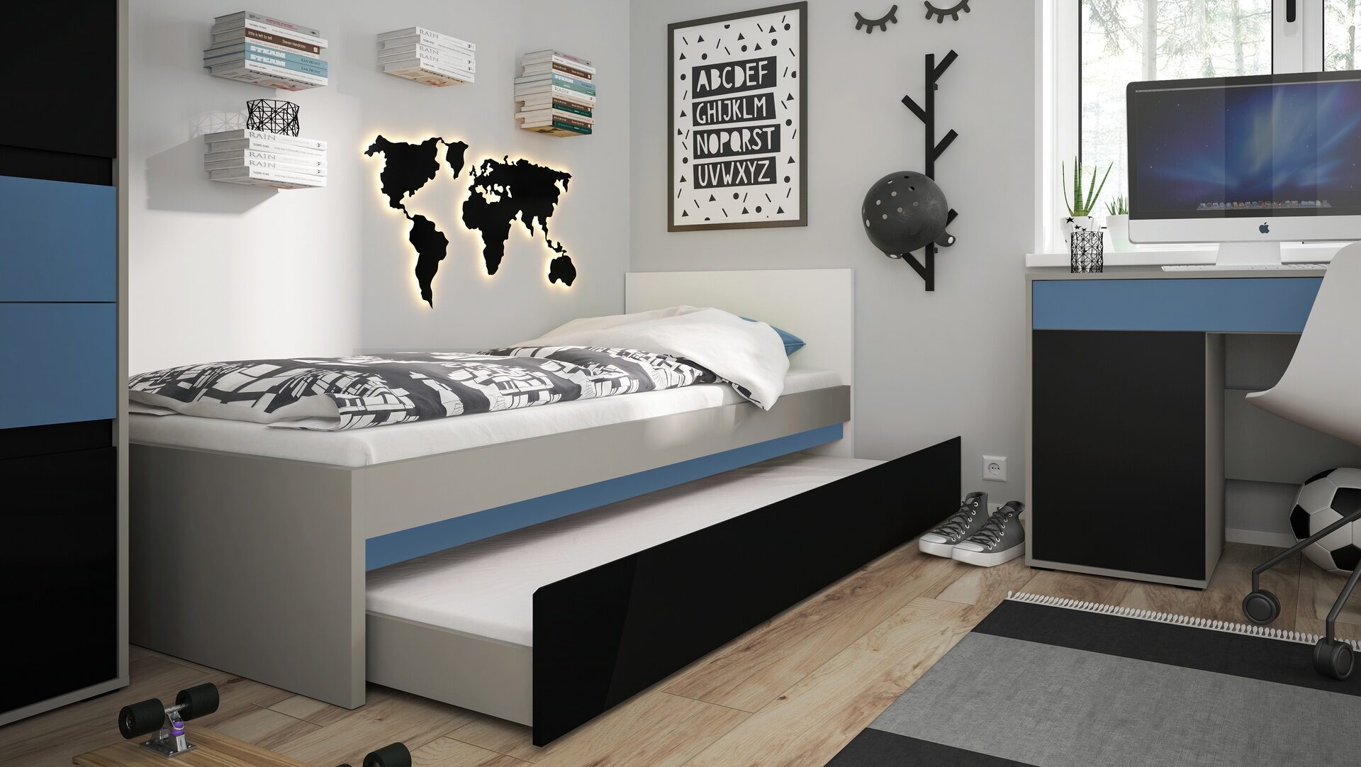 Nowoczesna kolekcja do pokoju młodzieżowego łączy szary korpus z bazowymi białymi i czarnymi frontami, a całość przełamuje modny akcent zgaszonego błękitu. Dzięki temu meble wyglądają lekko, świeżo i bardzo „na czasie”, a jednocześnie pozostają uniwersalne i łatwe do zestawienia z dodatkami oraz tekstyliami. Proste bryły i kontrastowe detale tworzą spójną aranżację, która dobrze odnajdzie się zarówno w pokoju nastolatka, jak i starszego ucznia. Kolekcja pomaga uporządkować przestrzeń do nauki, przechowywania i odpoczynku — tak, aby pokój był funkcjonalny na co dzień, ale nadal miał wyrazisty, młodzieżowy charakter.