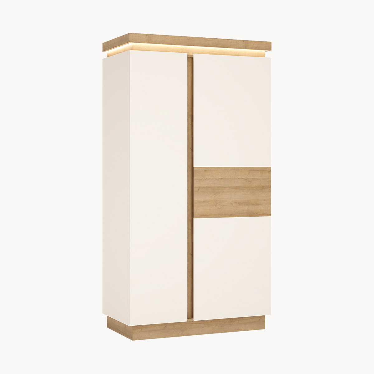 Komoda 2-drzwiowa, 3 szuflady, podświetlana, dekor jasne drewno, biały połysk