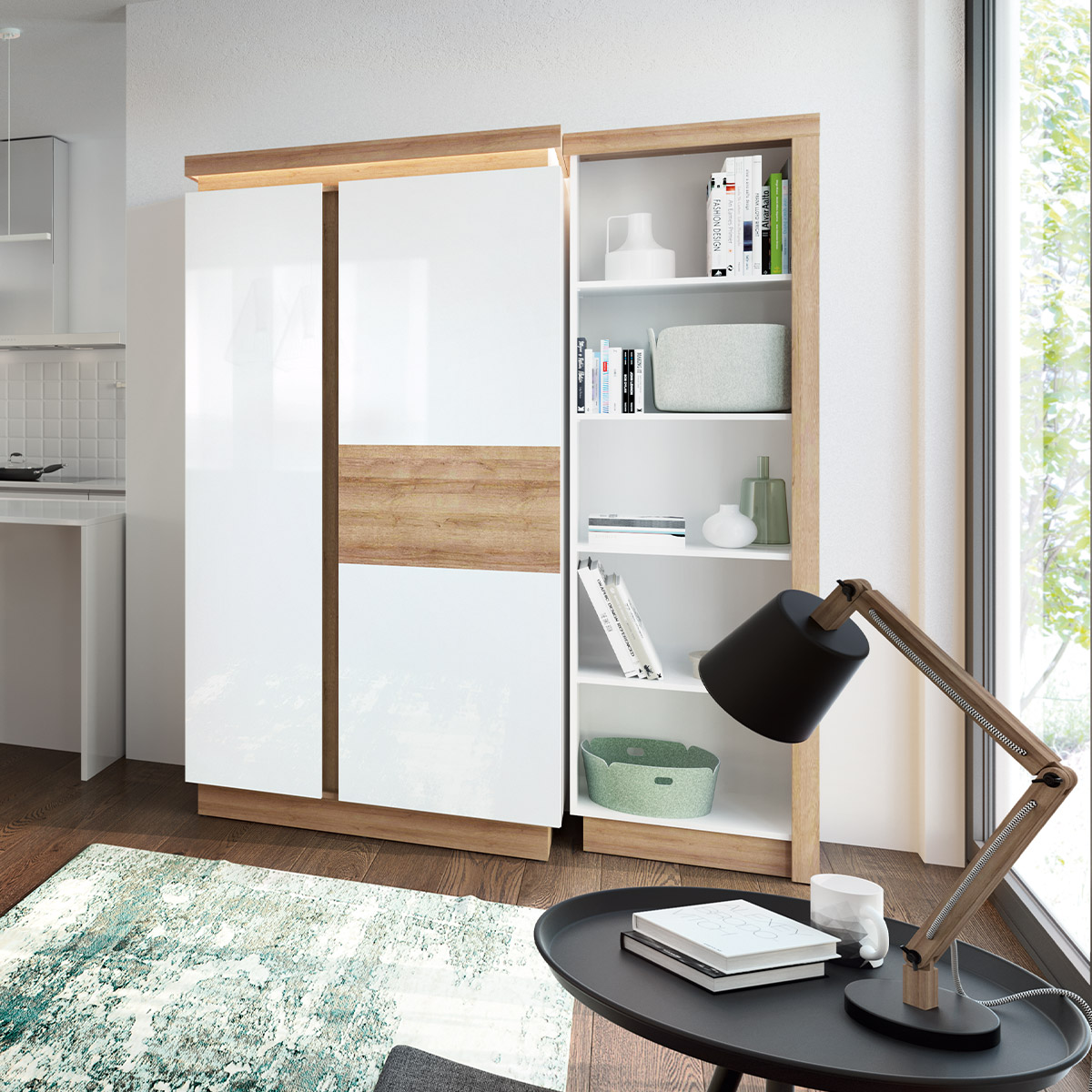 Witryna niska, lewostronna, przeszklony bok, podświetlana, dekor jasne drewno, biały połysk
