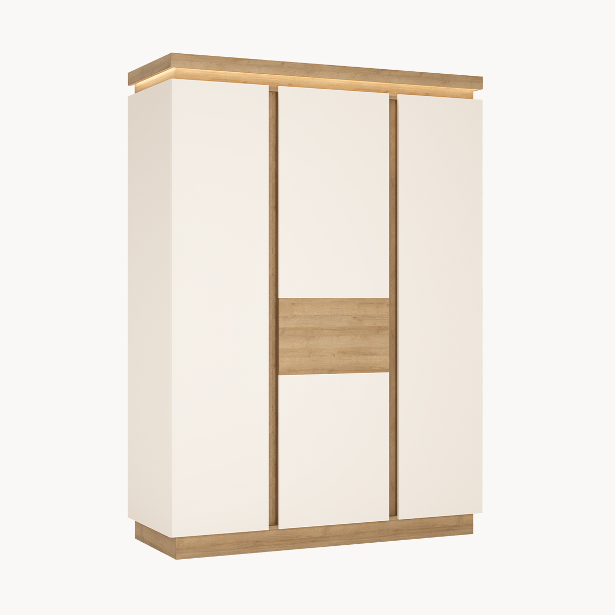 Komoda 3-drzwiowa, przeszklona, podświetlana, dekor jasne drewno, biały połysk