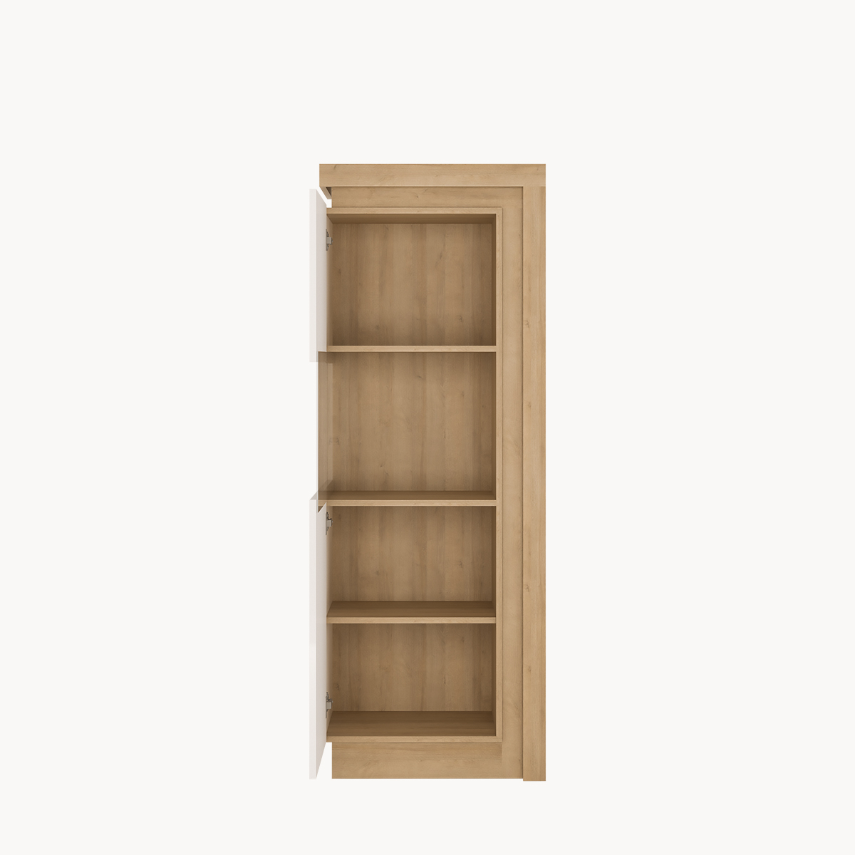 Regał wysoki z półkami, lewostronny, dekor jasne drewno, biały połysk