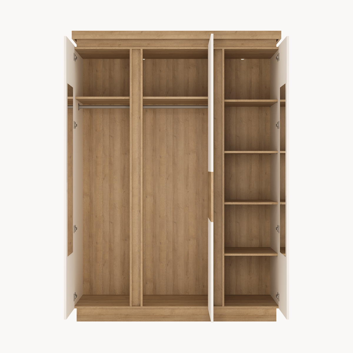 Szafa 4-drzwiowa, drążki, półki, lustra, podświetlana opcjonalnie, dekor jasne drewno, biały połysk
