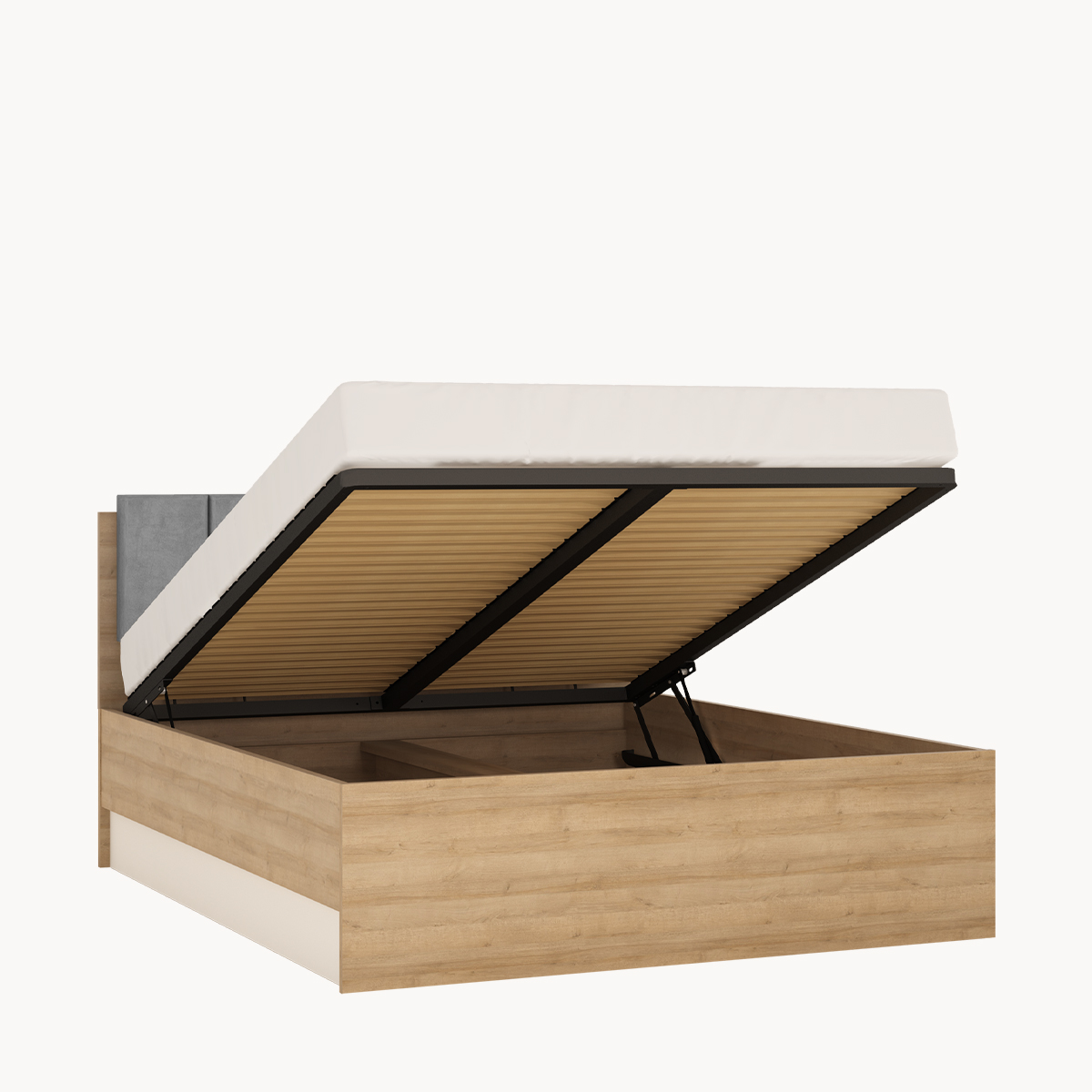 Łóżko dwuosobowe, 140x200cm, podnoszony stelaż, dekor jasne drewno, biały połysk