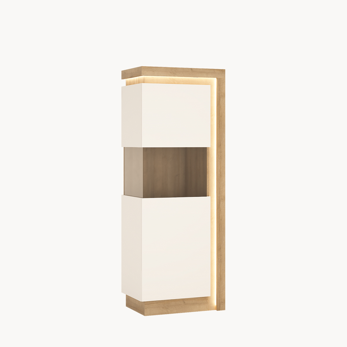 Witryna wysoka, lewostronna, przeszklony bok, podświetlana, dekor jasne drewno, biały połysk