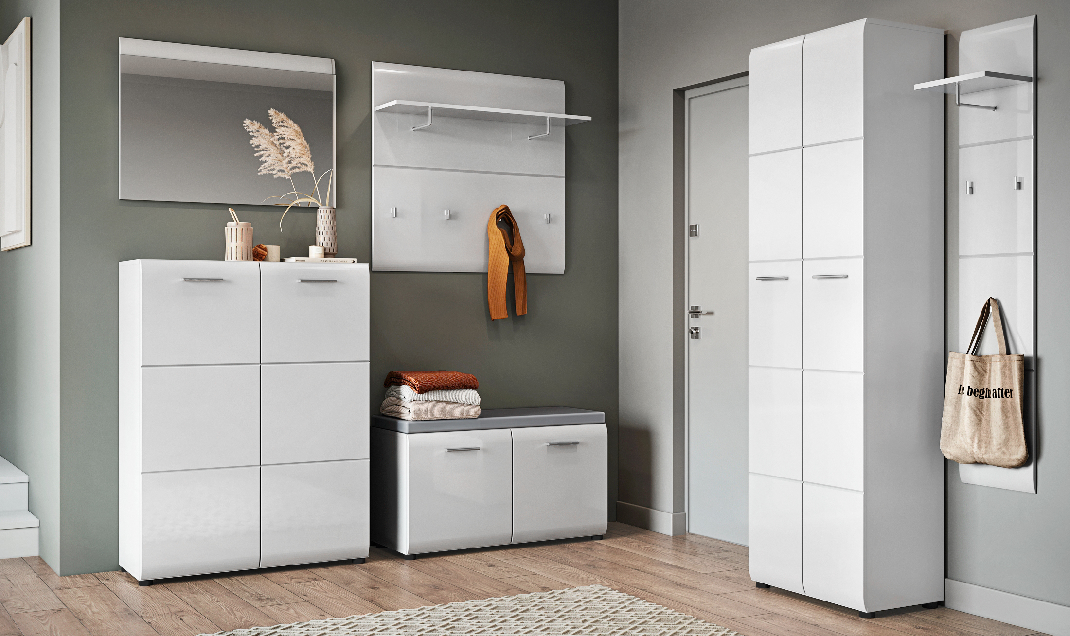 W minimalistyczny, a zarazem elegancki styl wystroju wnętrz idealnie wpisuje się kolekcja Merano. Nowoczesne, białe meble do przedpokoju, których fronty wykończone zostały w wysokim połysku doskonale odbijają światło i optycznie powiększają przestrzeń. Funkcjonalność, pojemność i wysoka jakość wykonania są ich dodatkowymi atutami.