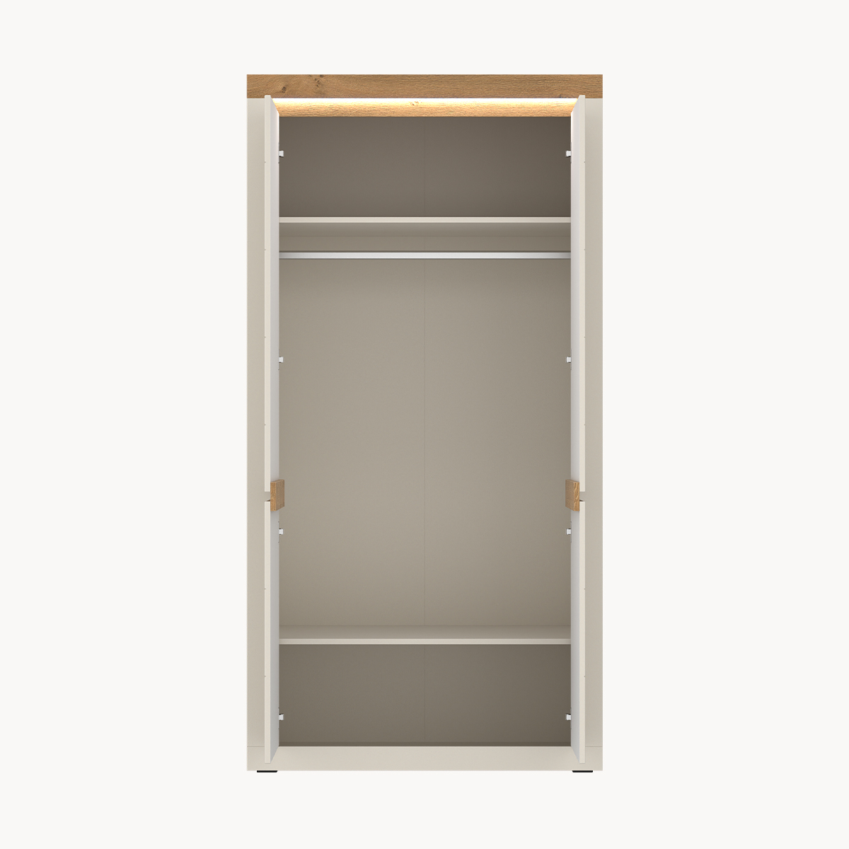 Duża szafa 2-drzwiowa do salonu, z drążkiem i dużymi półkami, kaszmir, z oświetleniem