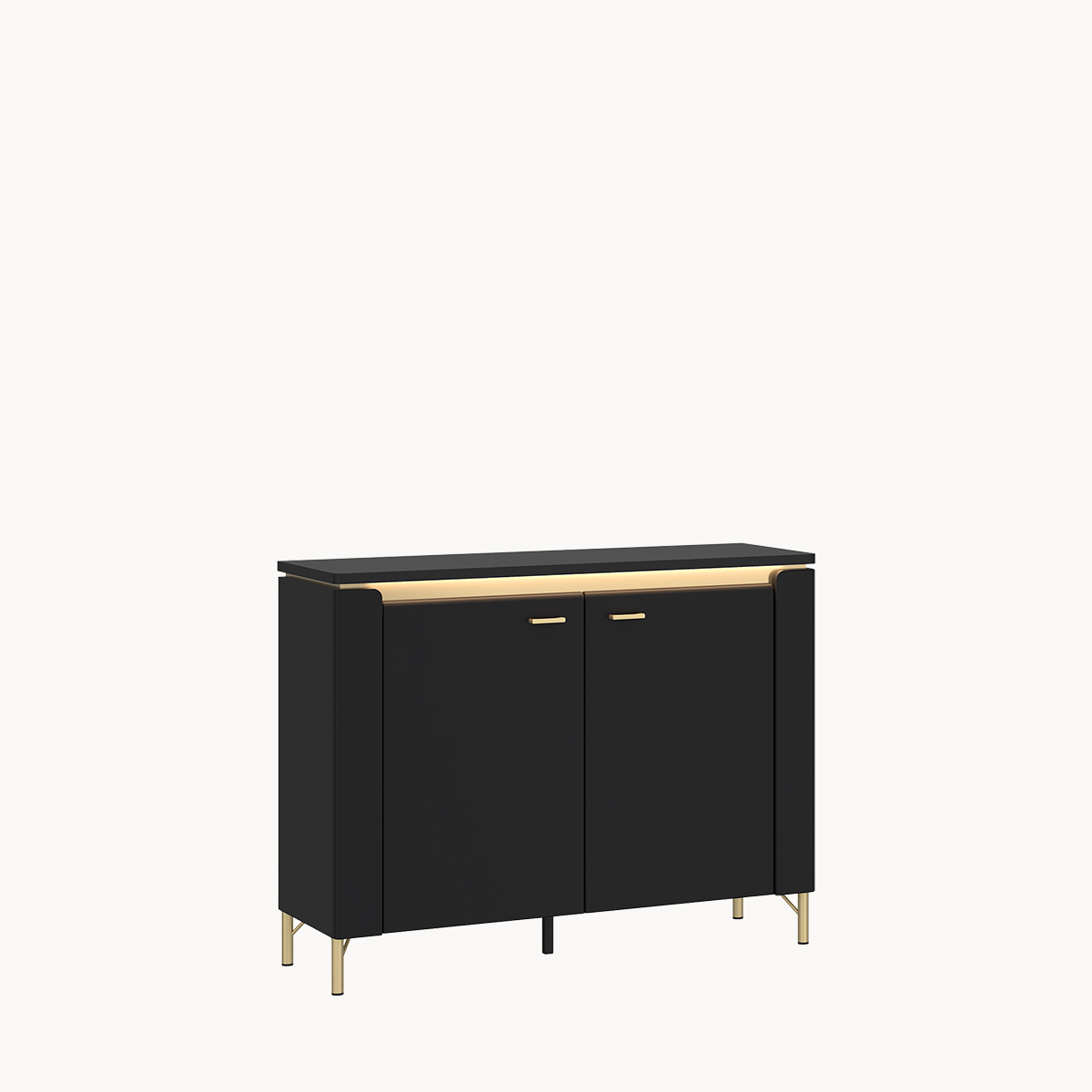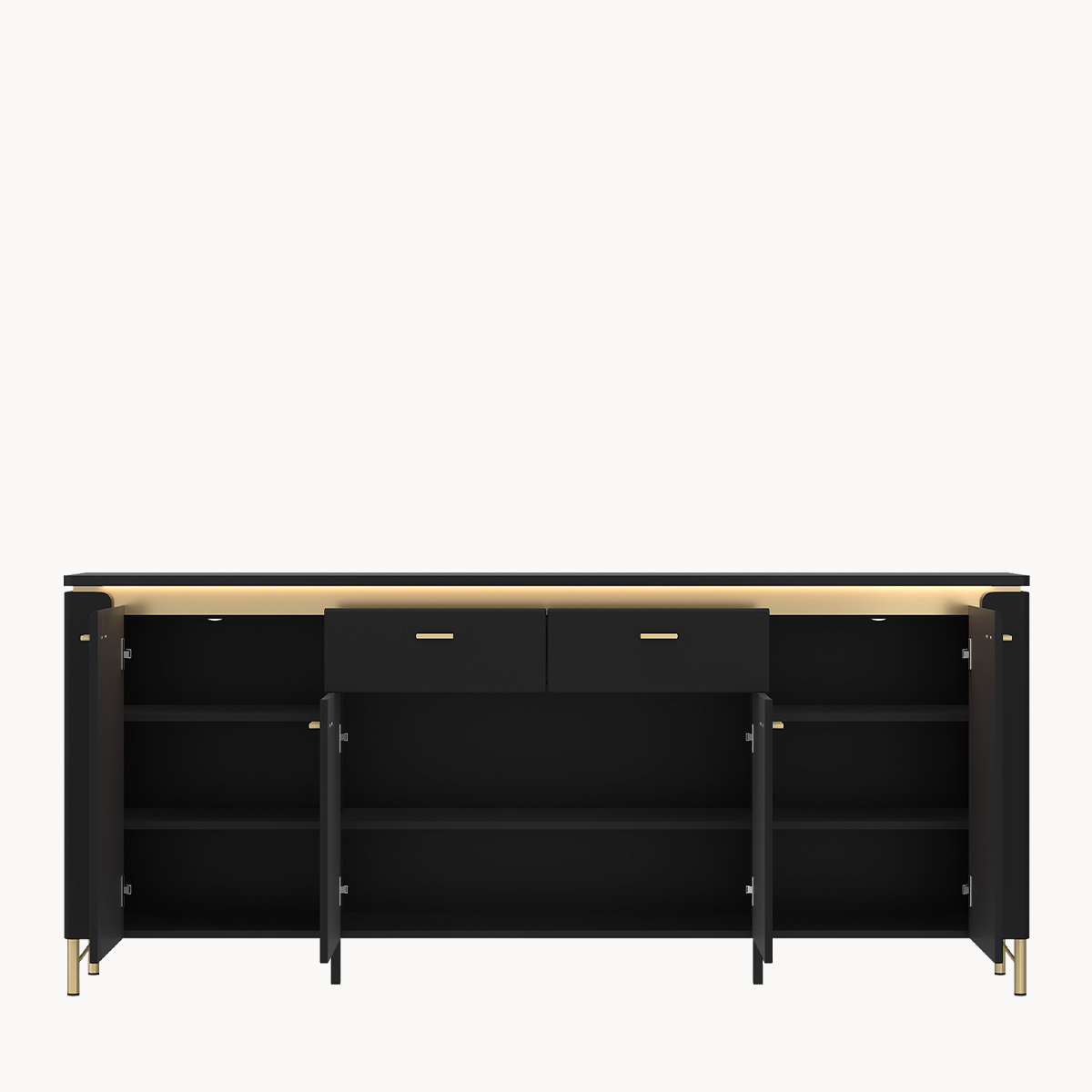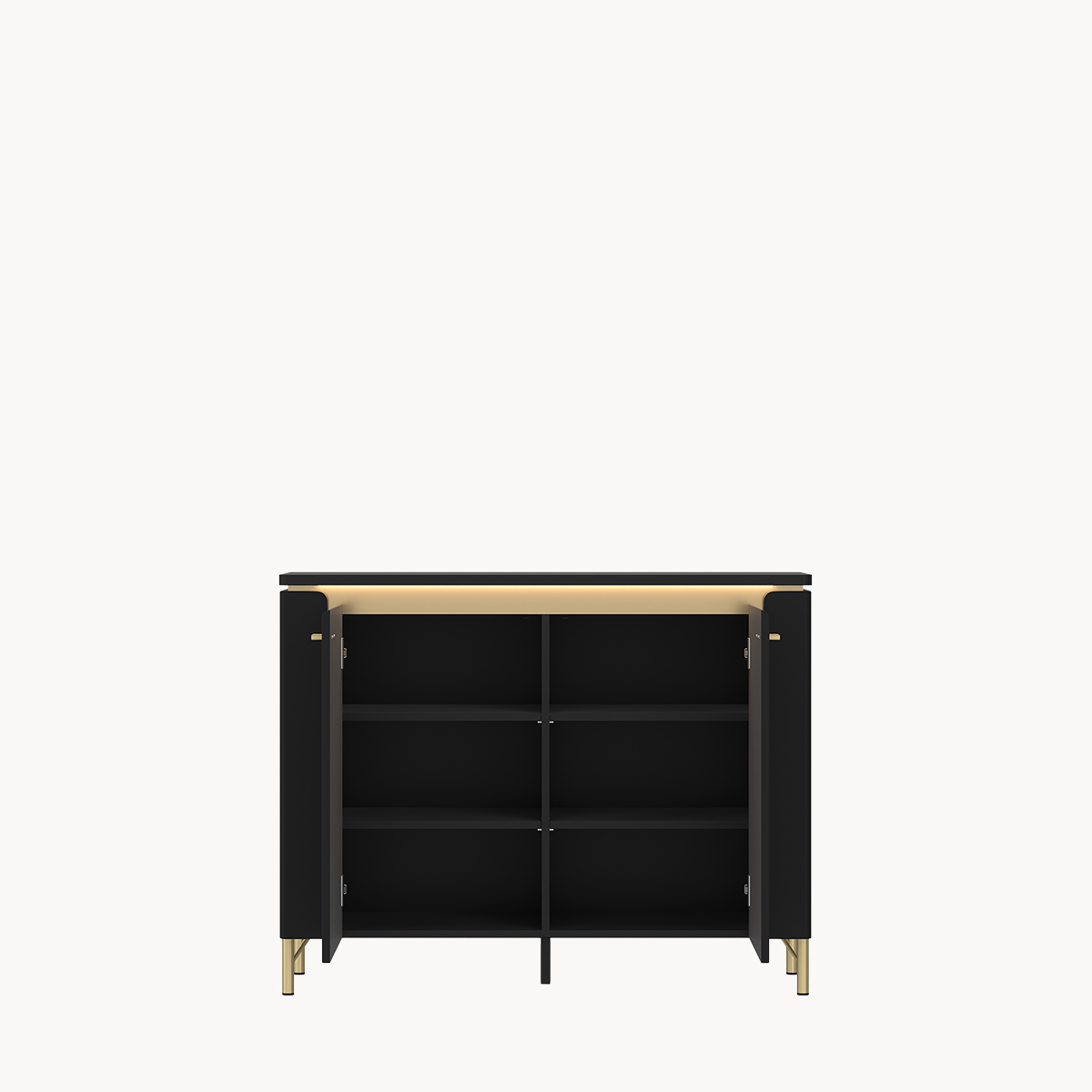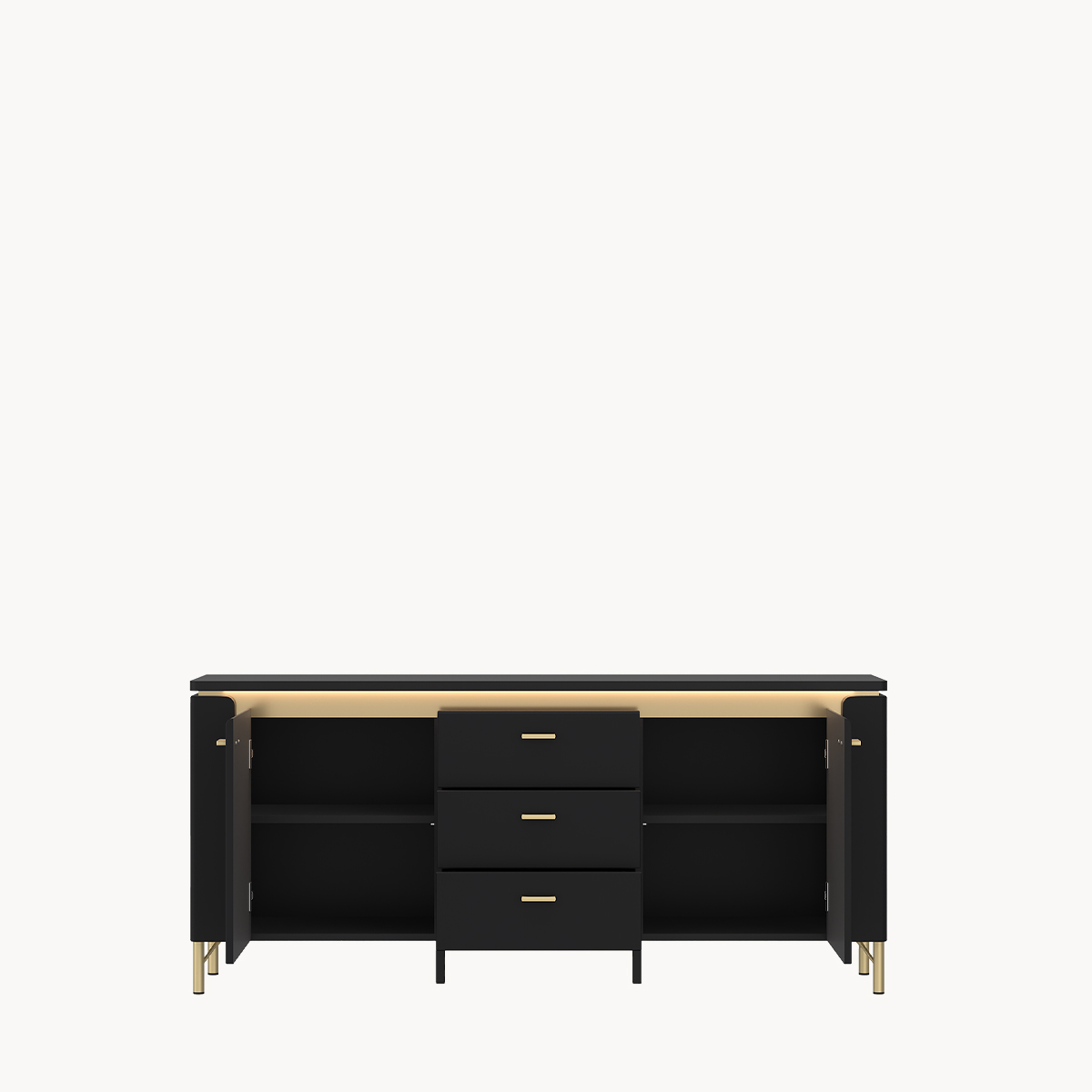 Komoda z półkami, czarny mat, na złotych nogach, z oświetleniem