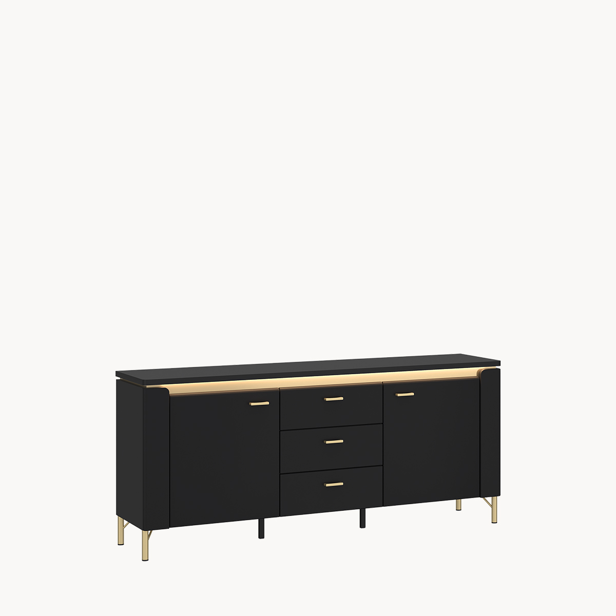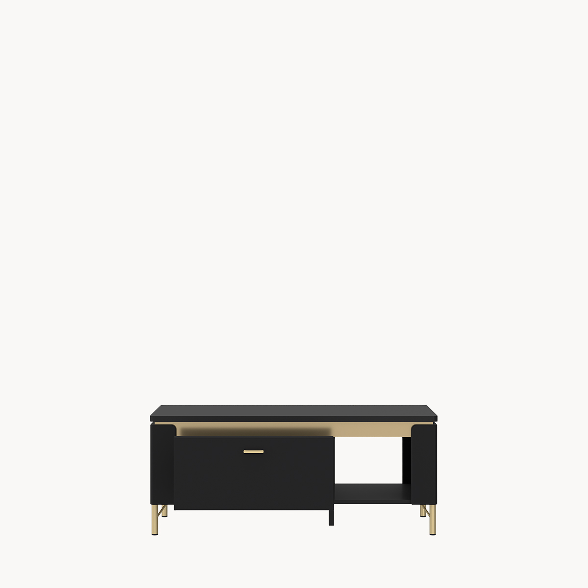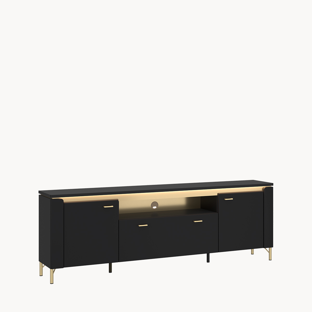 Komoda RTV z szufladami, czarny mat, na złotych nogach, z oświetleniem