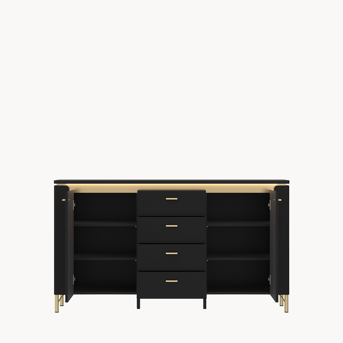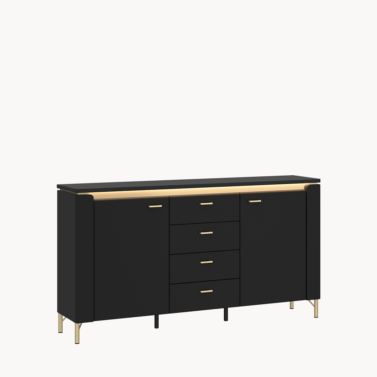 Komoda z 4 szufladami, czarny mat, na złotych nogach, z oświetleniem