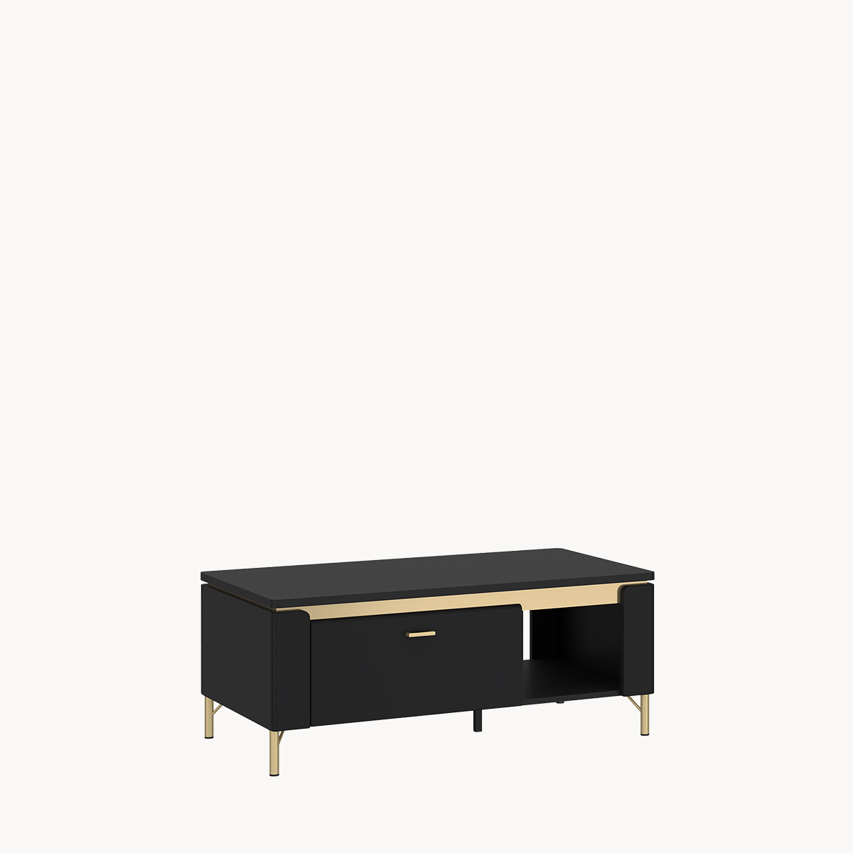Stolik kawowy z szufladą, czarny mat, na złotych nogach