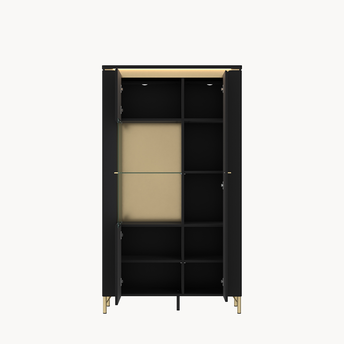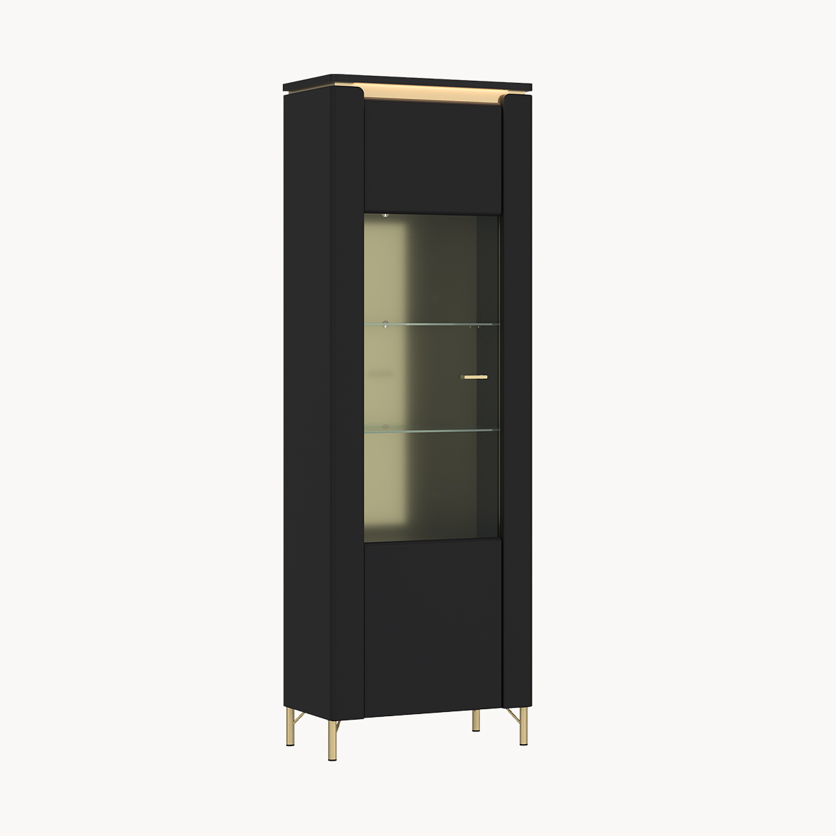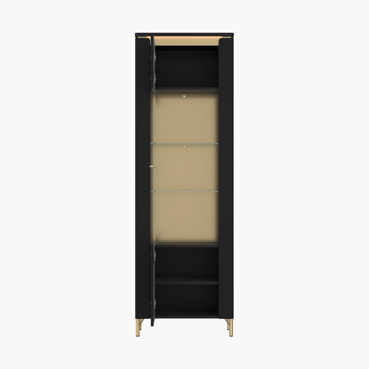 Witryna ze szklanymi drzwiami, czarny mat, na złotych nogach, z oświetleniem