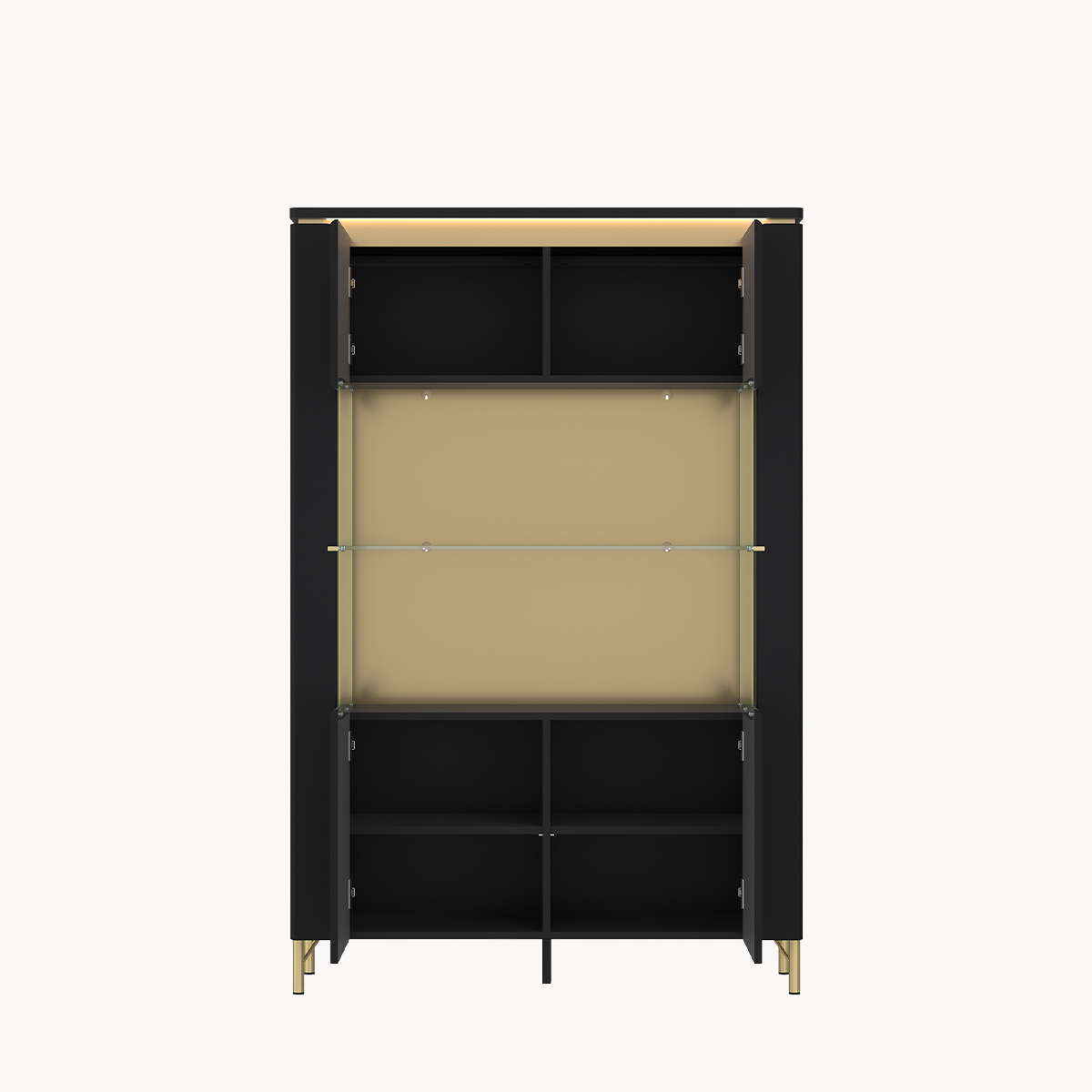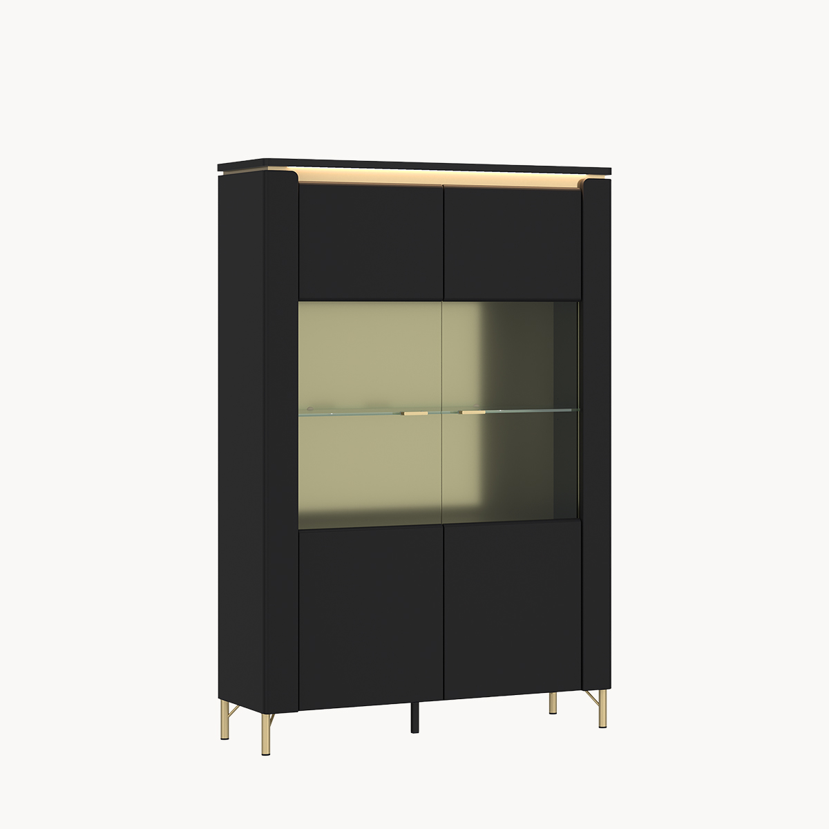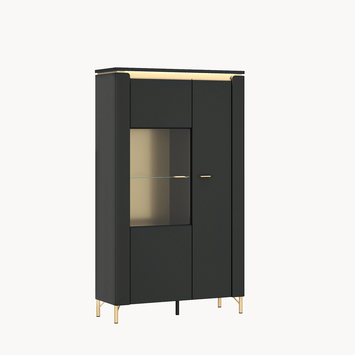 Witryna ze szklanymi drzwiami, czarny mat, na złotych nogach, z oświetleniem
