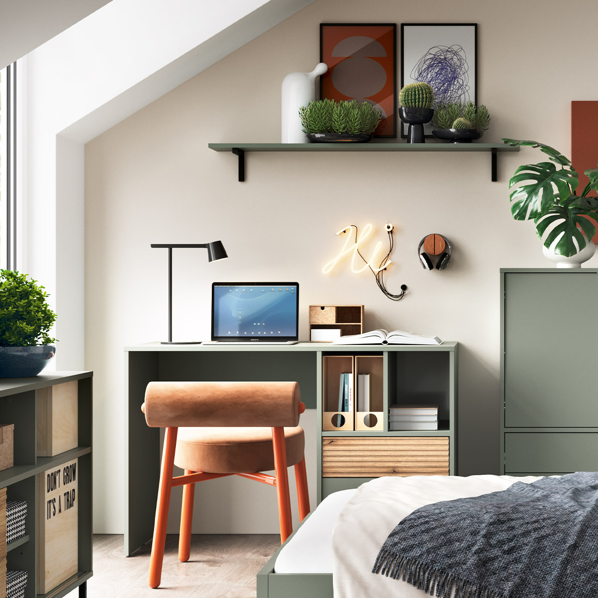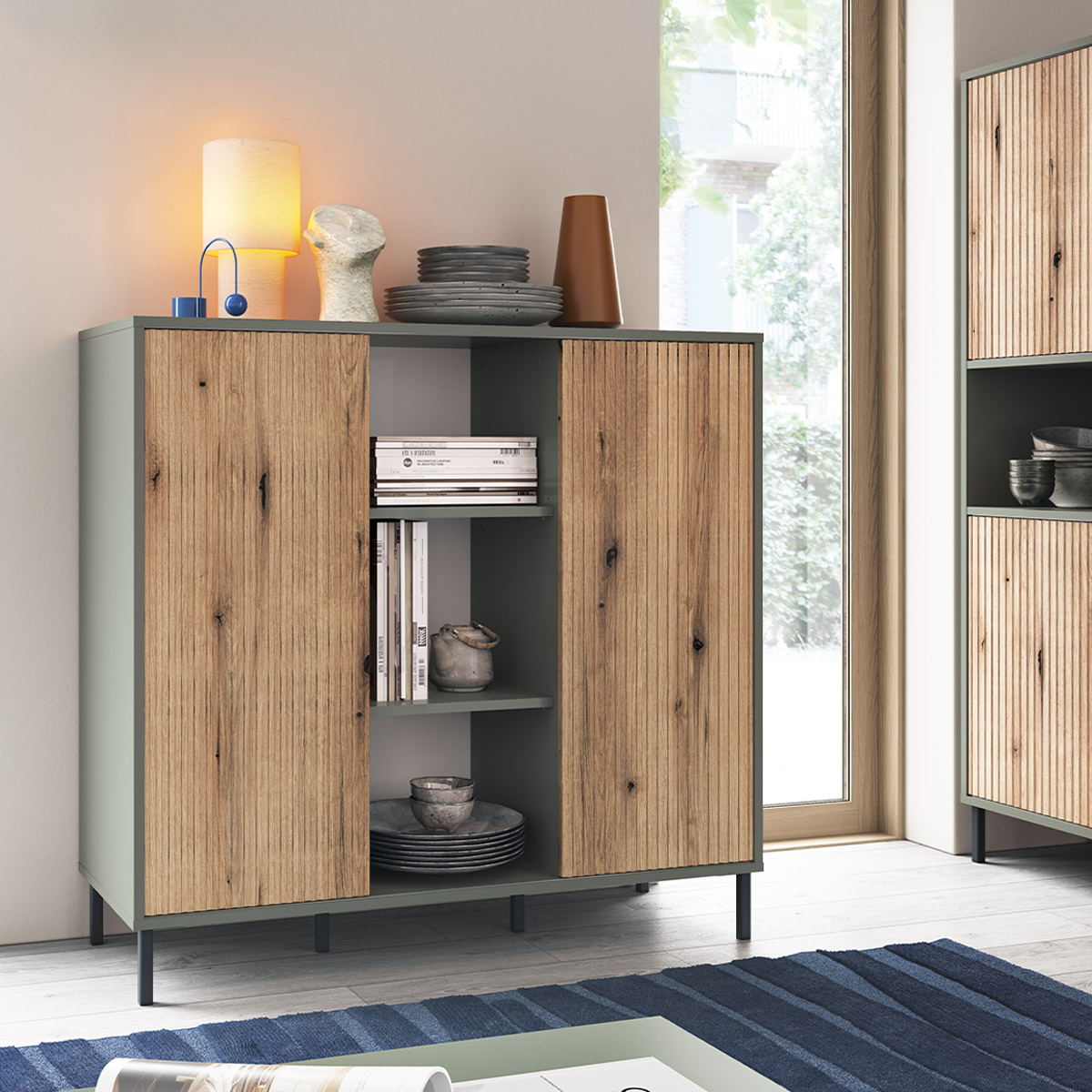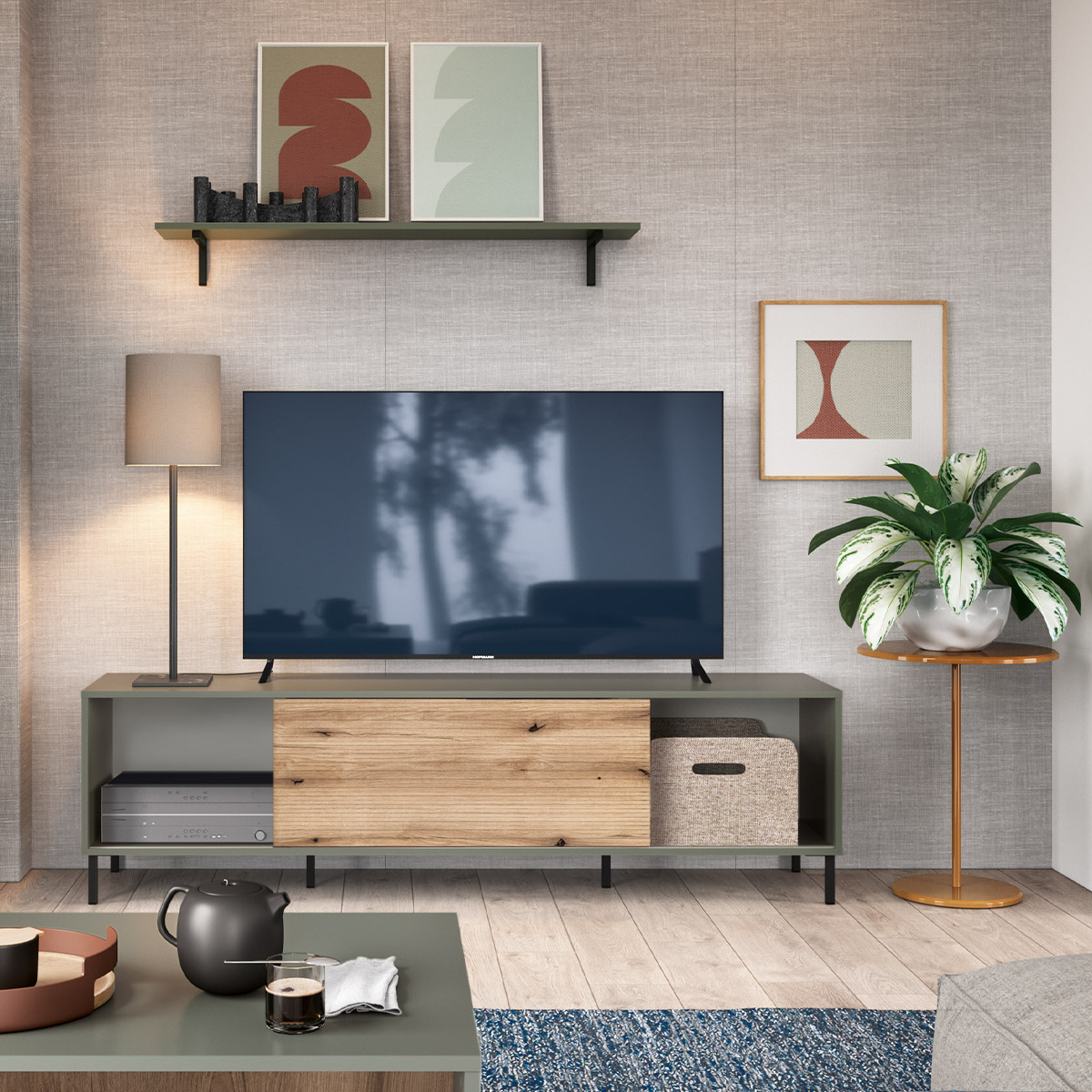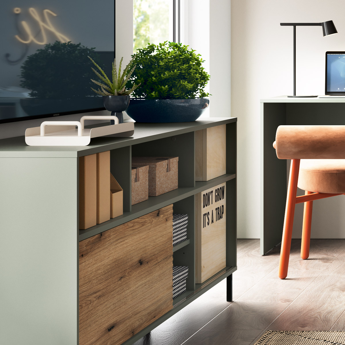 Komoda RTV z półkami, szarozielona, na metalowych nóżkach
