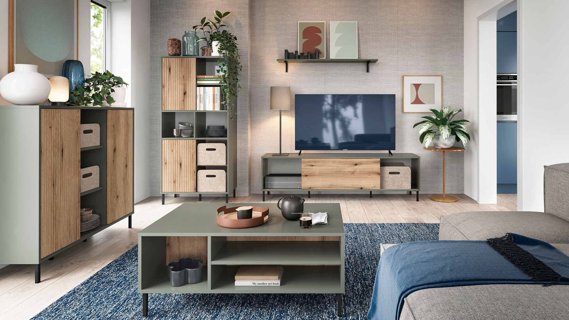 Kolekcja mebli Pozzi łączy elegancję i ponadczasowe kształty z efektownym zestawieniem szarozielonych odcieni i ryflowanych elementów w kolorze dębu. Funkcjonalne bryły na wysokich, metalowych nóżkach oraz nowoczesny mechanizm Push to open czynią ją idealnym wyborem do pokoju młodzieżowego, salonu i jadalni.