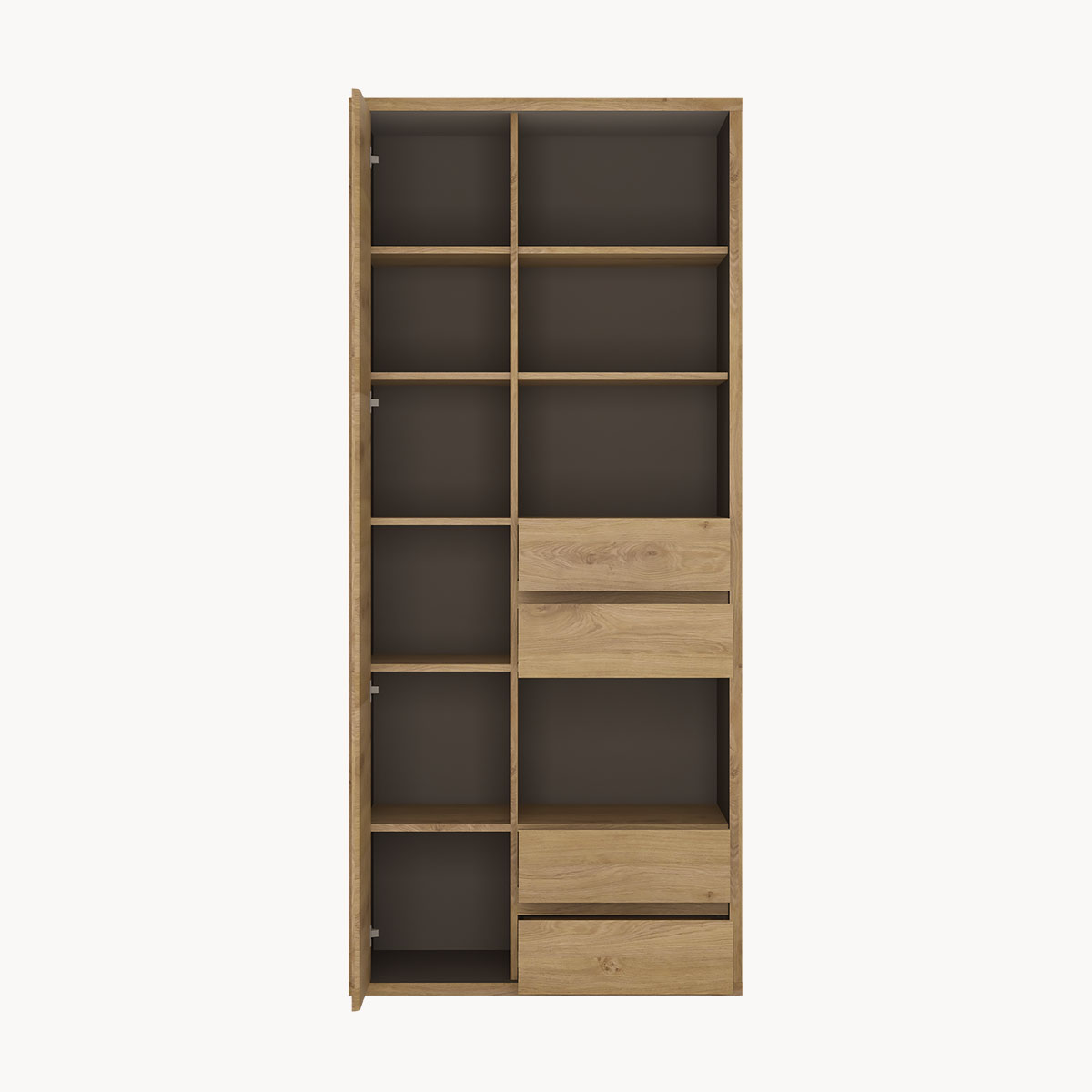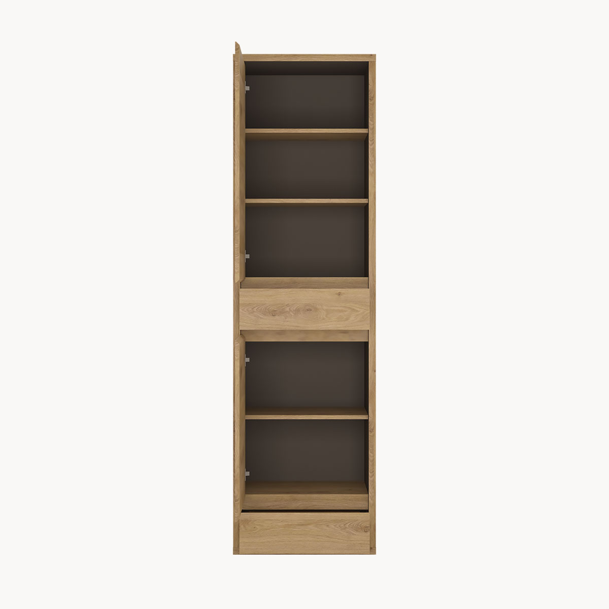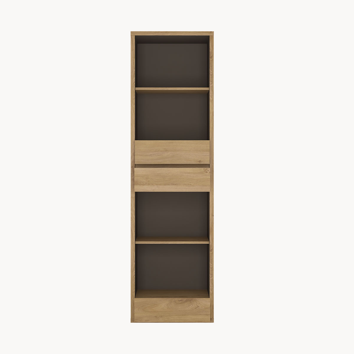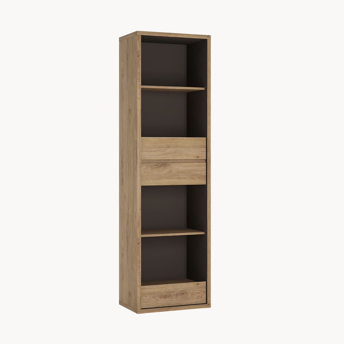 Wysoki regał, drewniany dekor, z otwartymi półkami