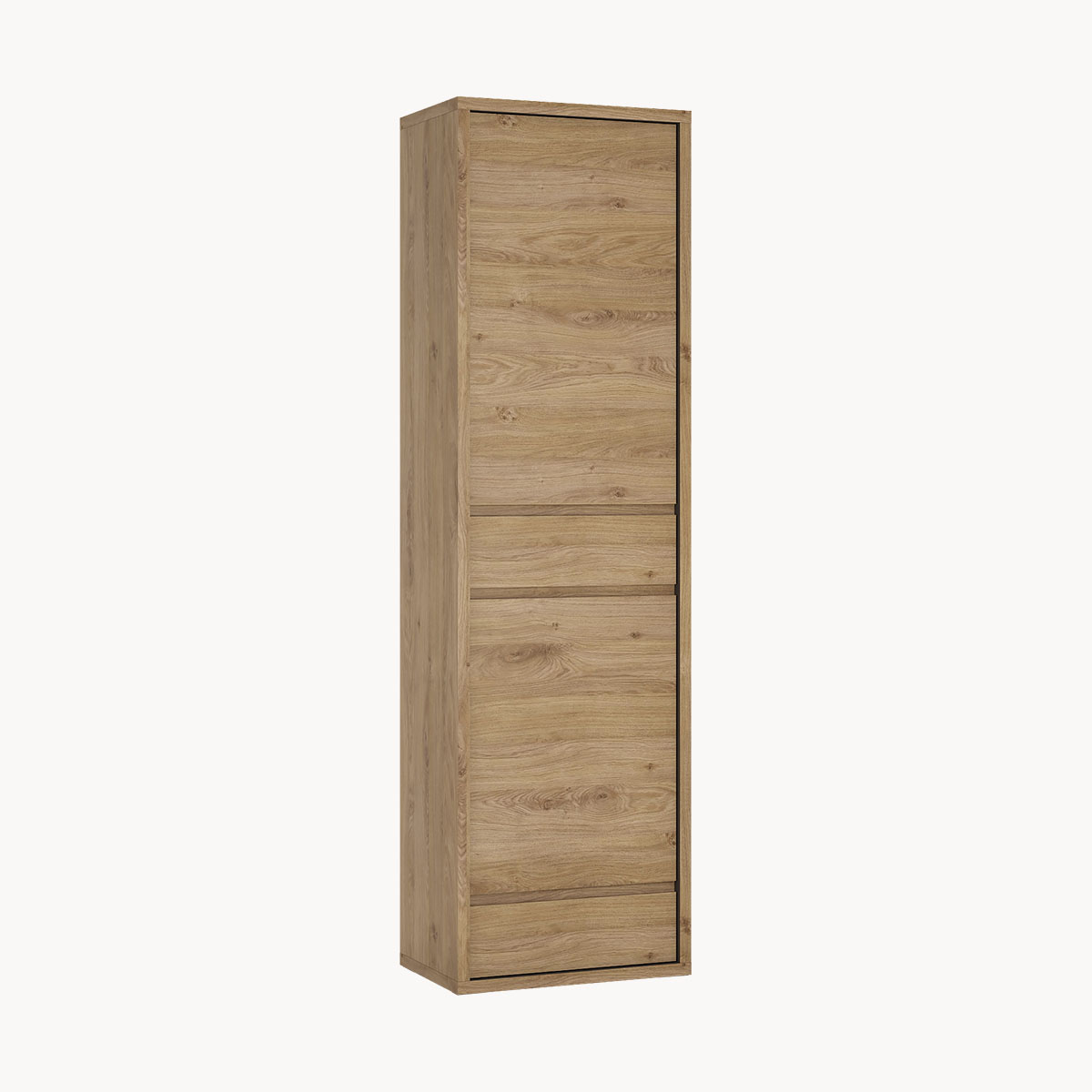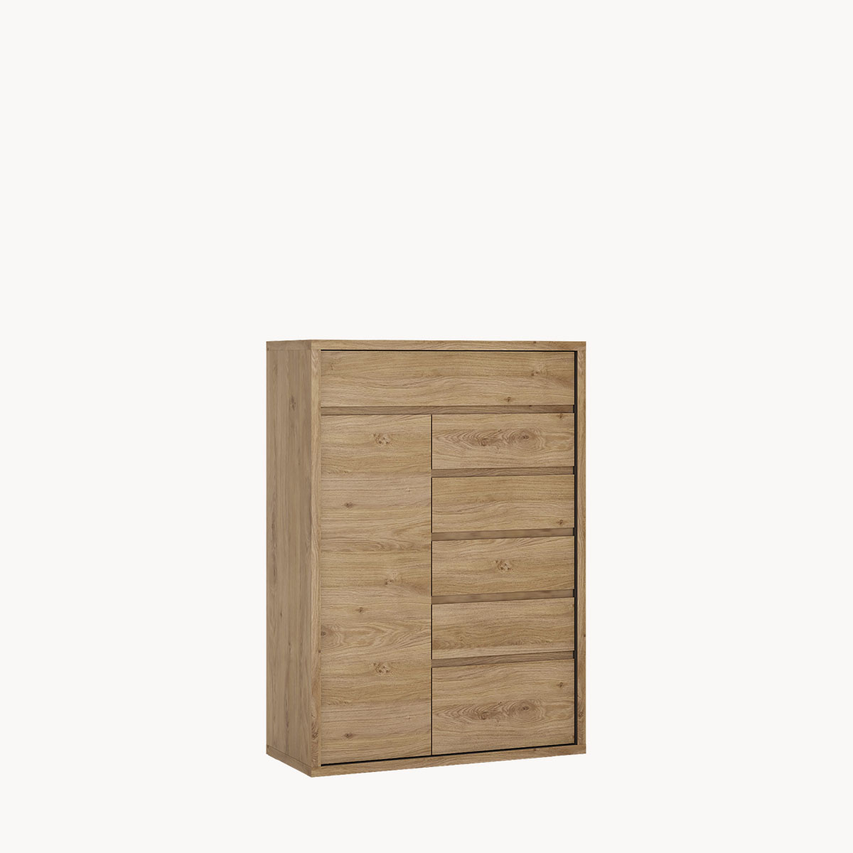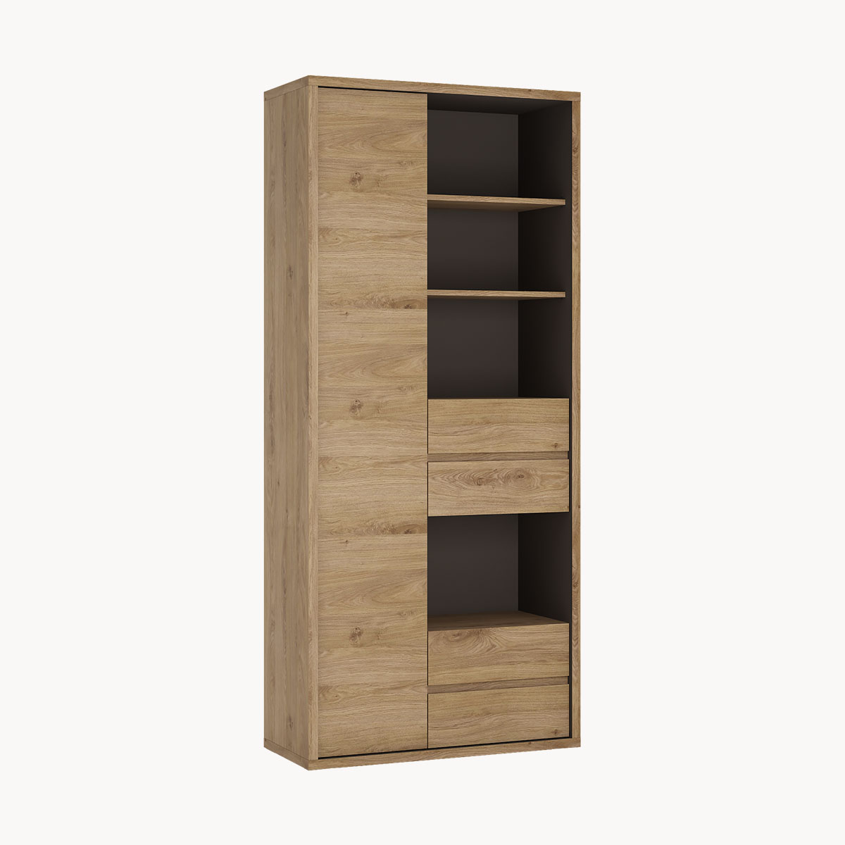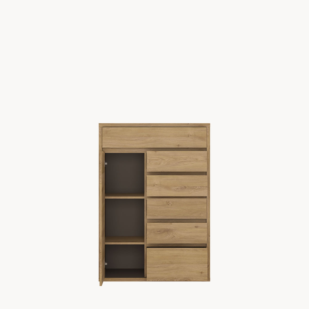 Wysoka komoda, drewniany dekor, z szufladami i półkami