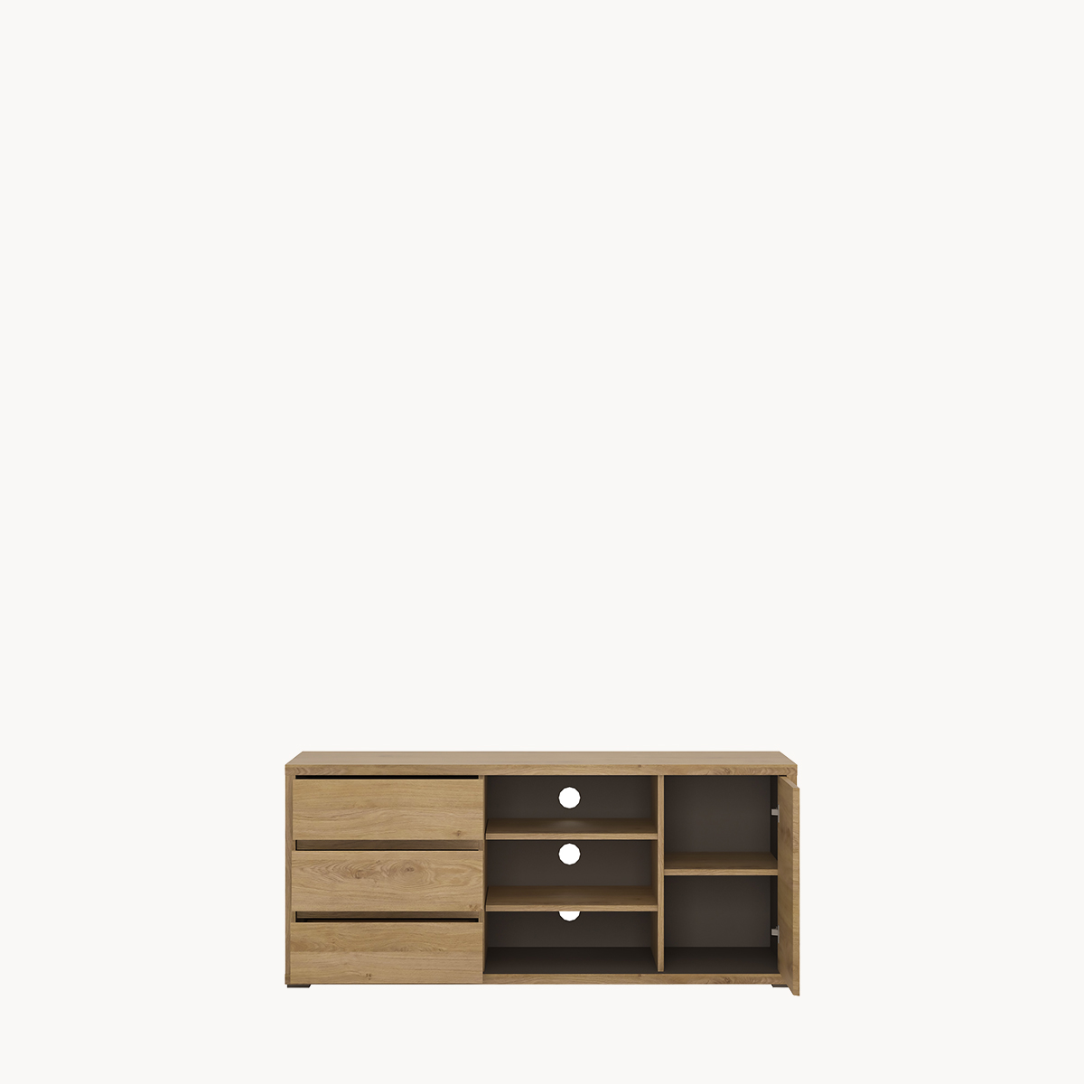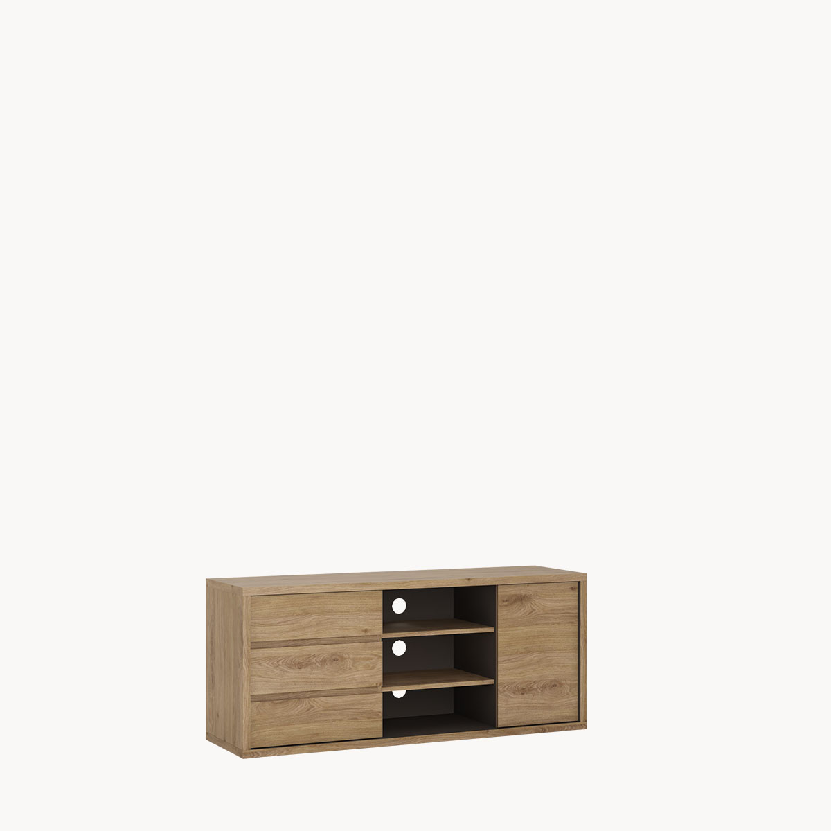 Komoda RTV, drewniany dekor, z szufladami i wnękami