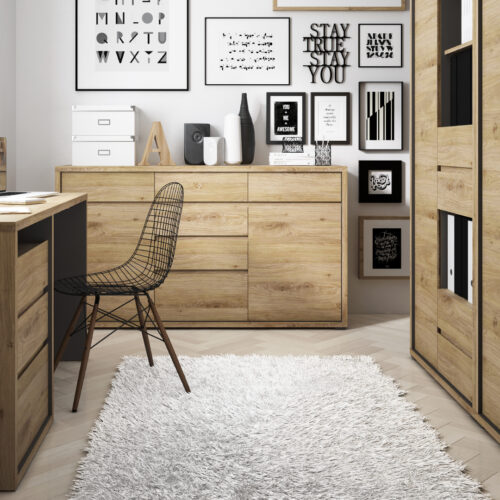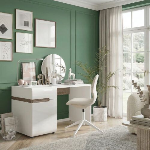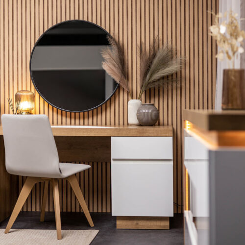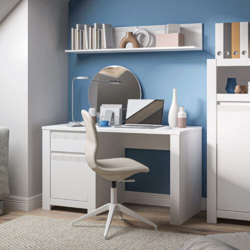 O ile pierwszy warunek może być kłopotliwy, o tyle do zaspokojenia drugiego wystarczy dosłownie kilka podstawowych mebli do biura w domu. Wąskie biurko z szufladami, podwieszana na ścianie półka i może regał lub komoda, gdzie po skończonej pracy można schować najważniejsze rzeczy, chroniąc je przed dziećmi czy domowymi zwierzątkami. I to wszystko! A jeśli chcesz, możesz przywiesić na ścianach dekoracje, dopełniając aranżacji i tworząc prawdziwy „pokój w środku pokoju”.