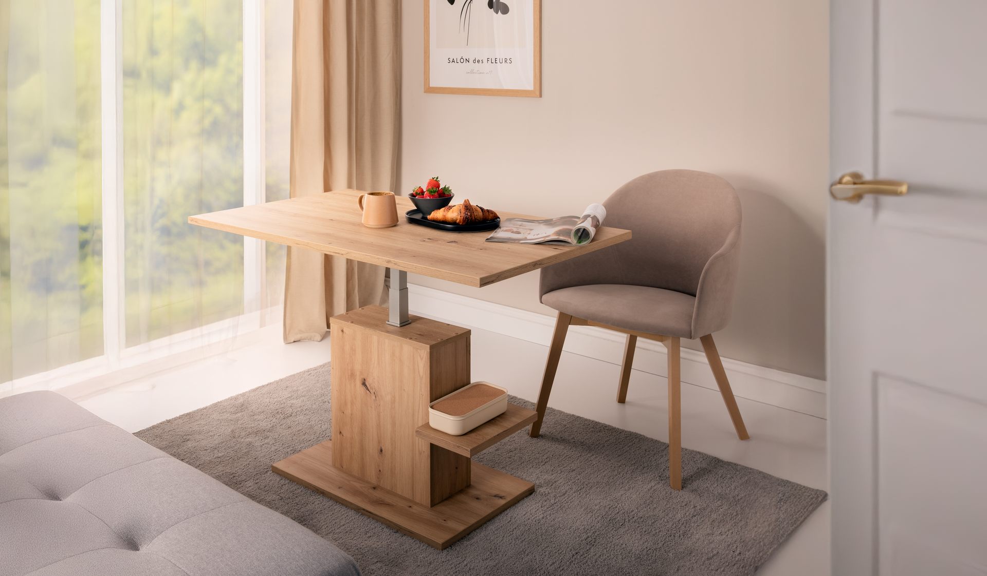Ławostół z półką i zaoblonymi krawędziami, rozsuwany i podnoszony blat, kolor drewno