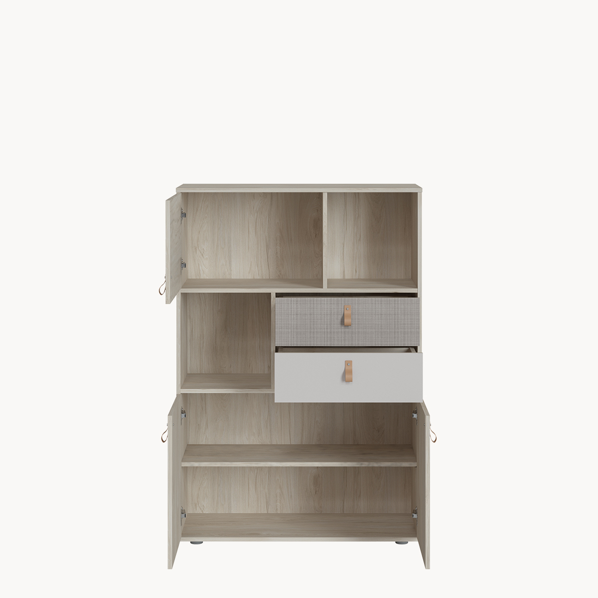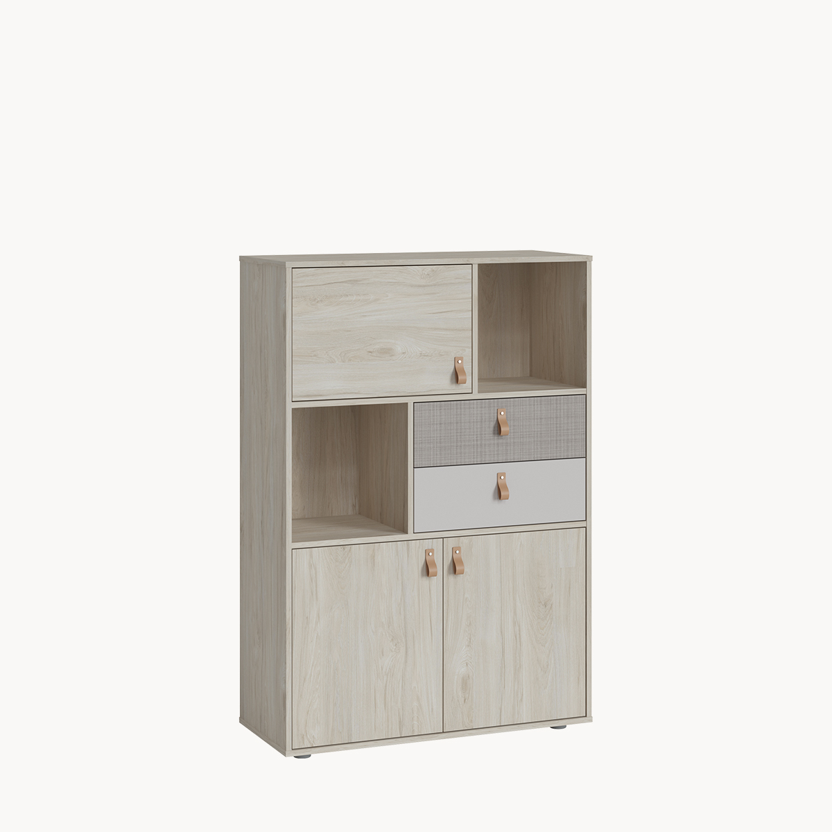 Komoda wysoka 3-drzwiowa z szufladami, jasny dekor, skórzane uchwyty