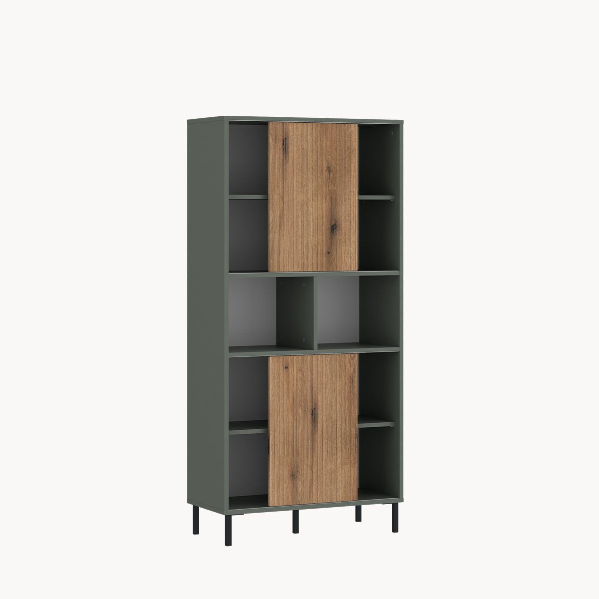 Wysoki regał z półkami, szarozielony, na metalowych nogach