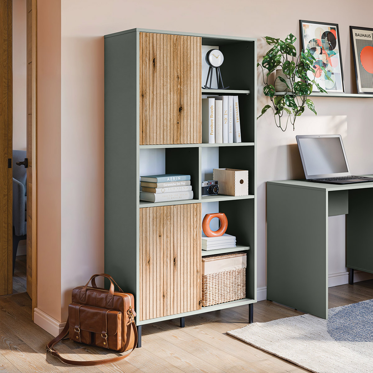 Wysoki regał, drewniany dekor, zamykany