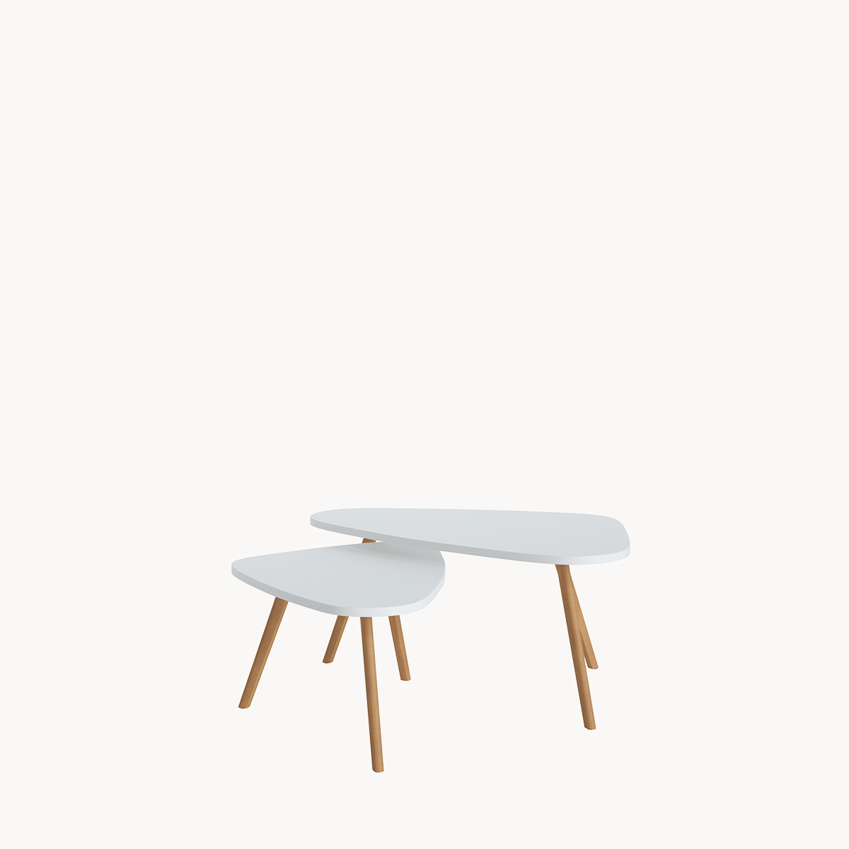 2 stoliki kawowe, białe, z drewnianymi nogami