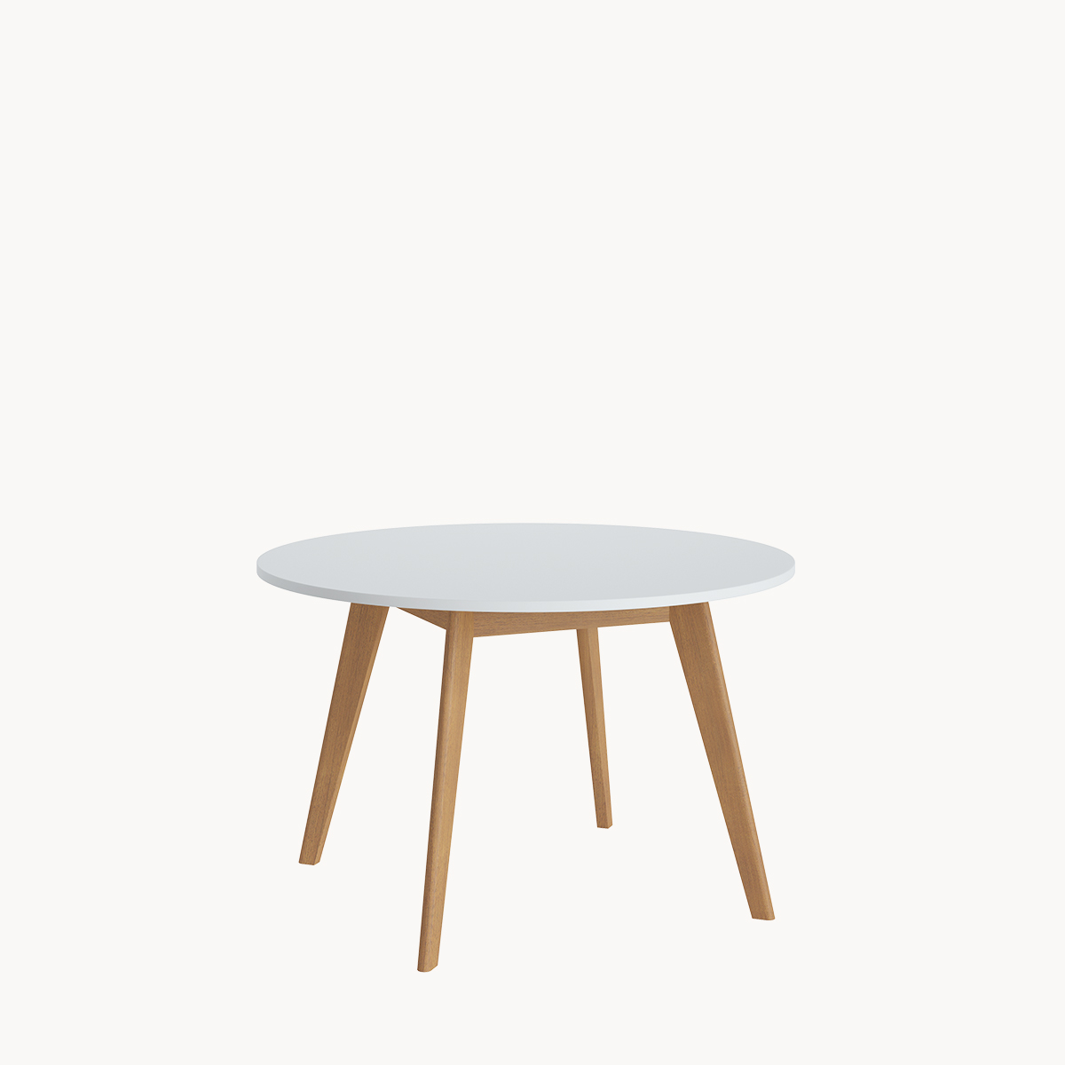 Okrągły stół, biały blat, z drewnianymi nogami
