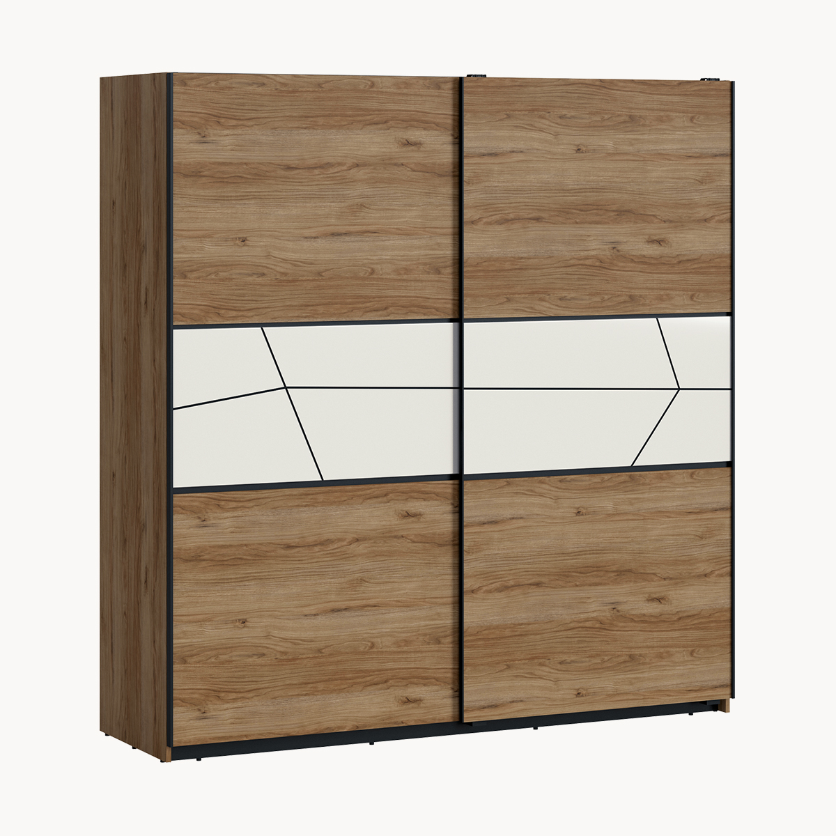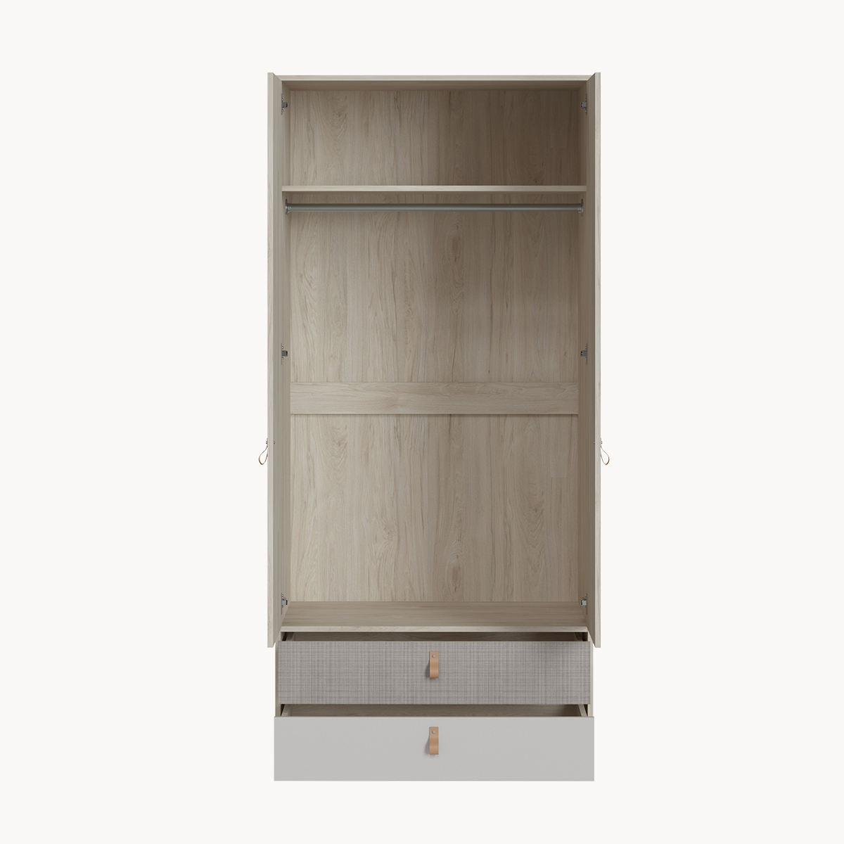 Szafa 2-drzwiowa z szufladami, skórzane uchwyty, dekor jasne drewno