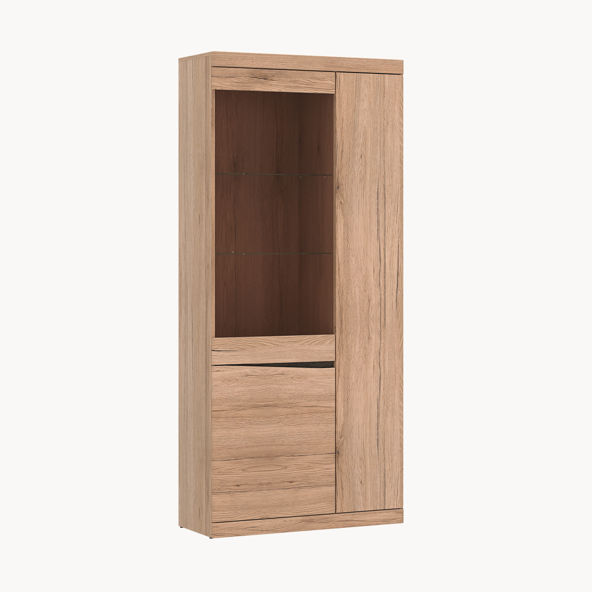 Drugi wariant witryny ma przeszklone mniejsze powierzchnie. Meble takie jak Lyon czy Havana pozwalają zaprezentować mniej, ale uwaga oglądającego jest o wiele bardziej skupiona na konkretnych przedmiotach. Zobaczy dokładnie to, co chcemy i w pełni to doceni.